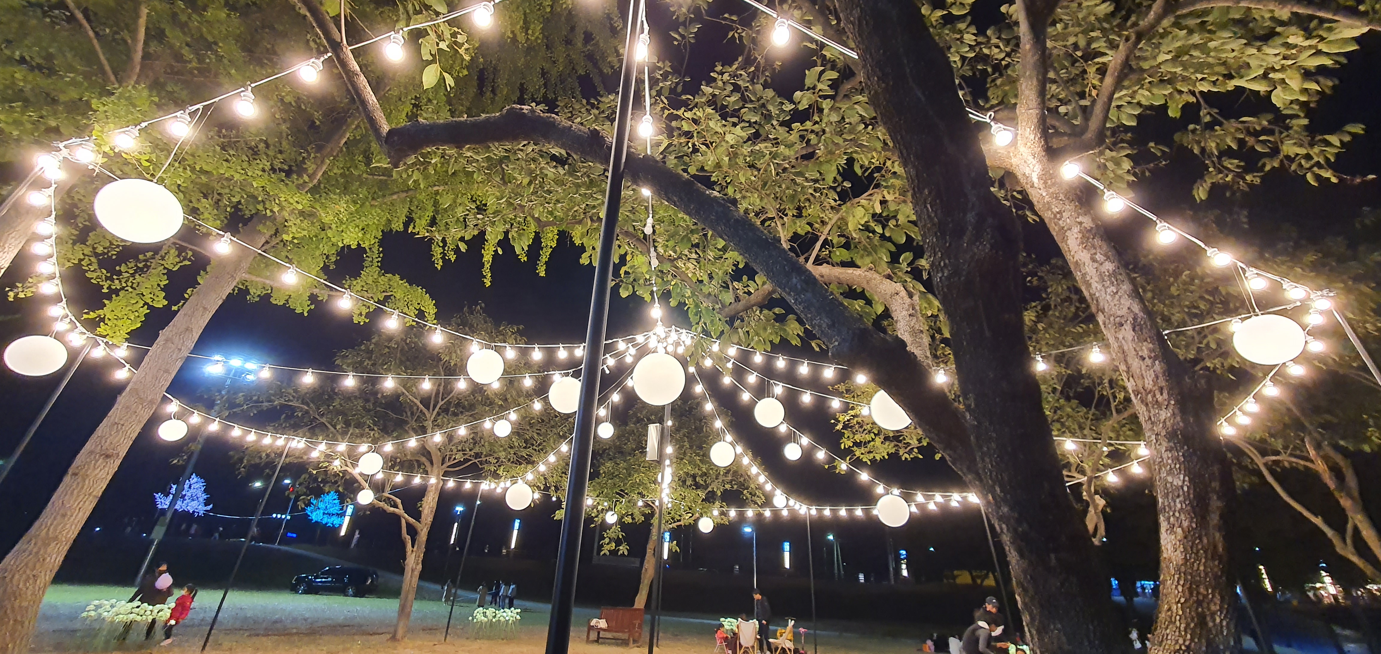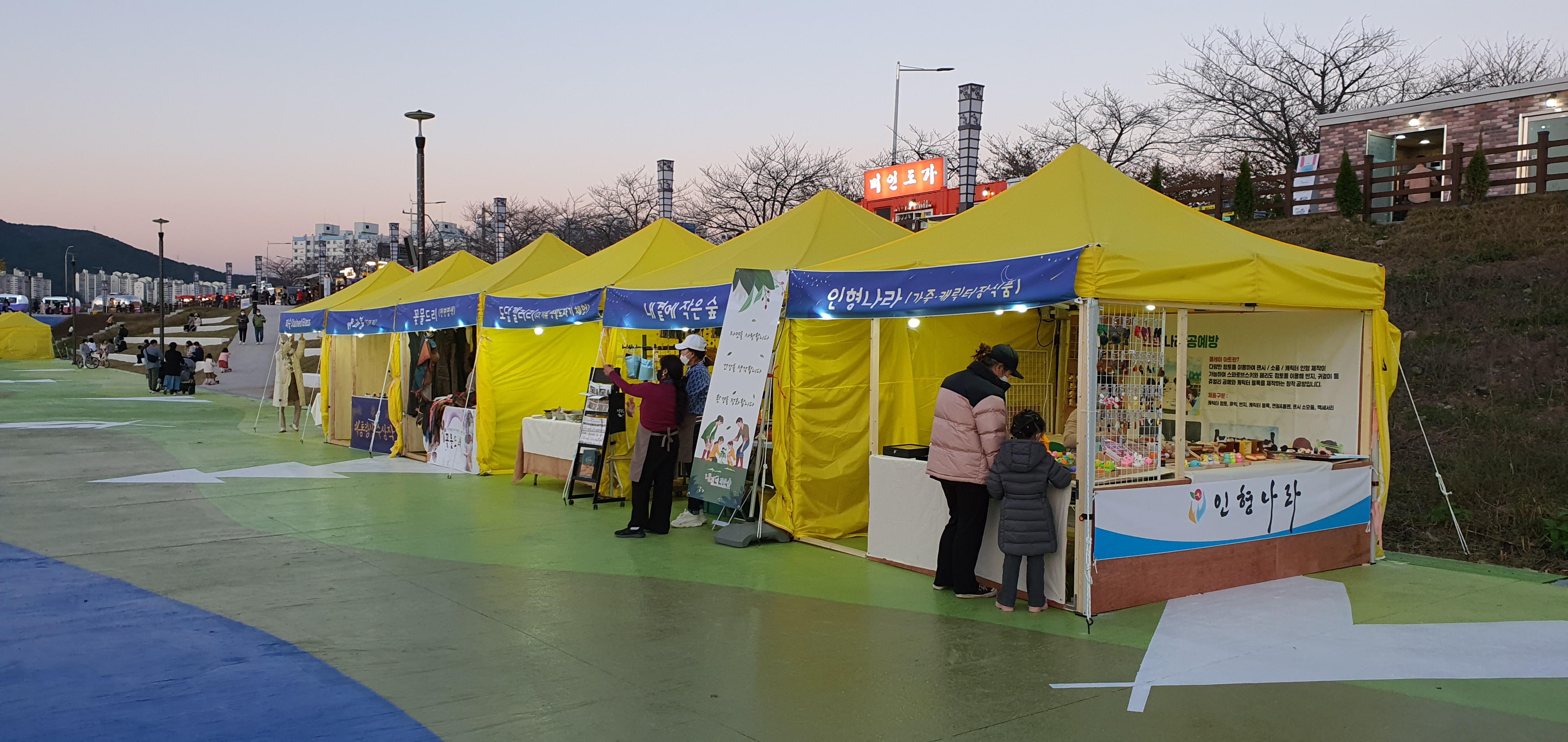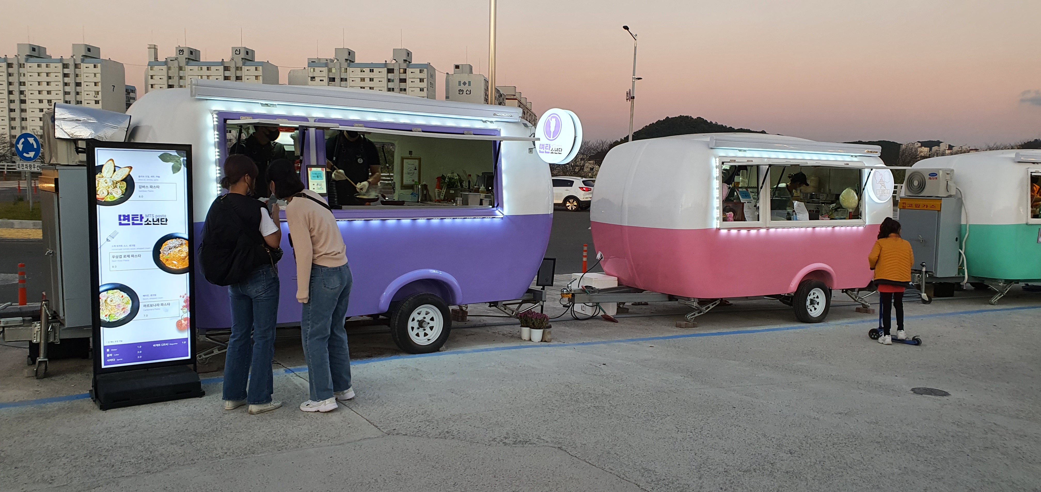 노란색 천막들은 사실 야시장 운영 주체들은 아니고 기업체 등에서 나와서 자사 제품 홍보나 체험 마당의 한 종류였고 여기서 이제 조금만 더 걸어서 언덕으로 올라가면 푸드 트럭들이 일자로 서있는 곳이 보입니다.
