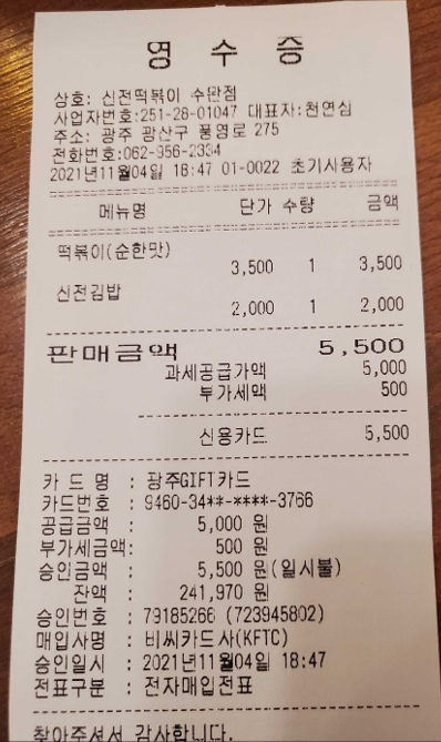 저희는 신점 김밥 한 줄과 신전떡볶이 중간 매운맛 하나로 테이크 아웃해갔습니다.