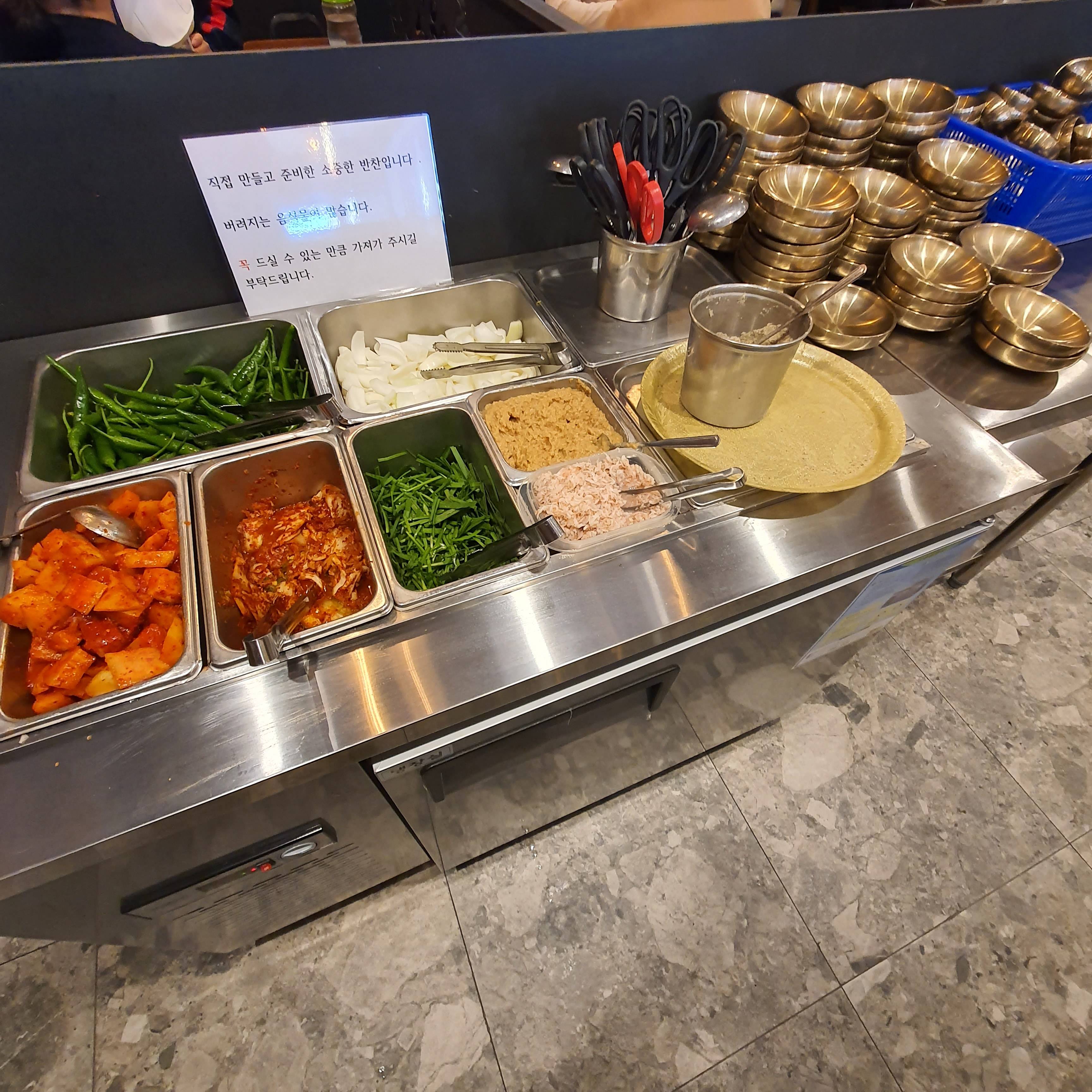 예전에는 밑반찬 리필은 무조건 점원을 통해서만 하는 게 당연했던 시절이 있었는데 사람이 얼마나 많이 붐비는지 이제는 밑반찬 리필을 별도로 손님이 양껏 가져갈 수 있도록 가게 한가운데에 별도의 리필 바가 생겼네요.