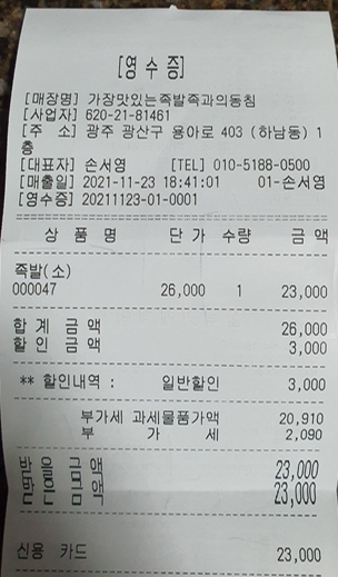 원래 가격은 26,000원인데 방문포장을 해서 3천 원 할인을 받았습니다.