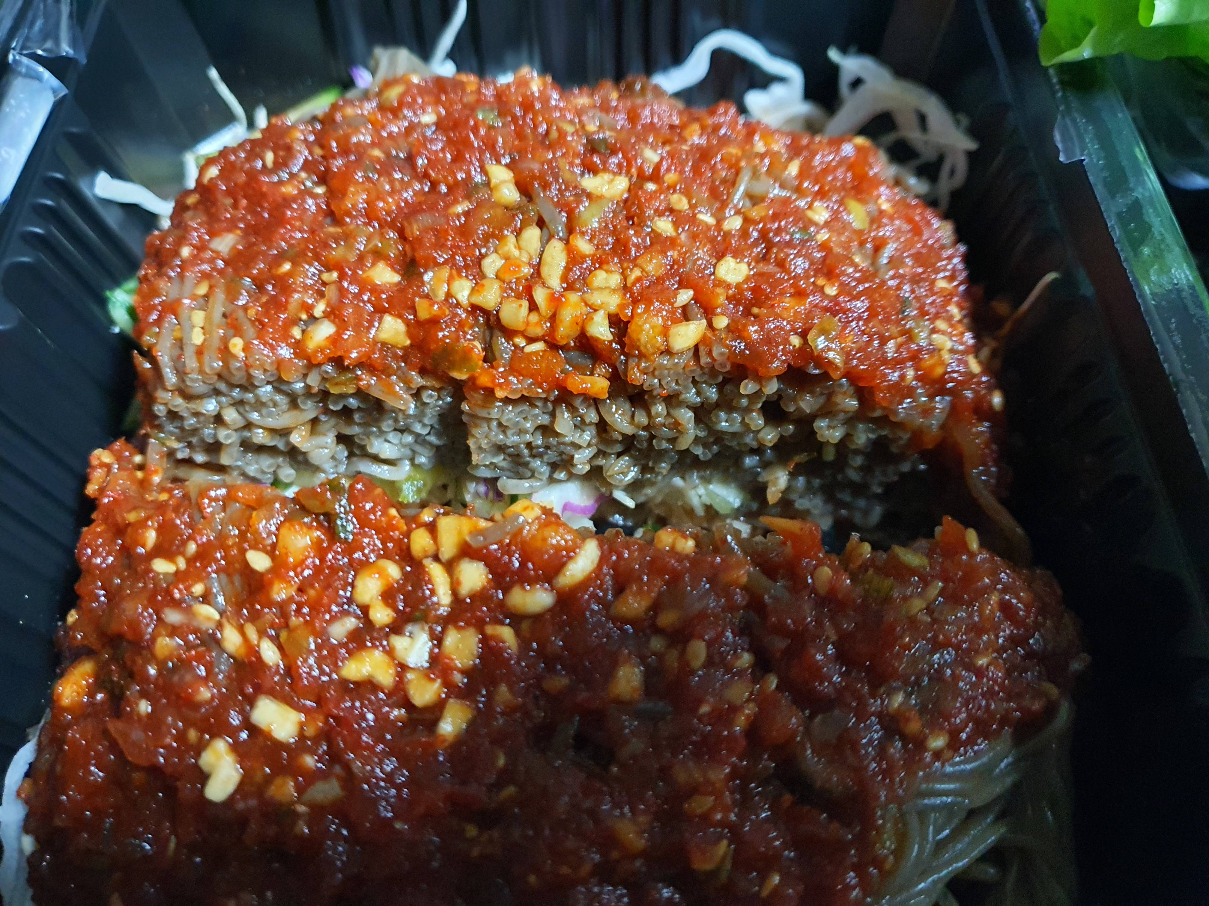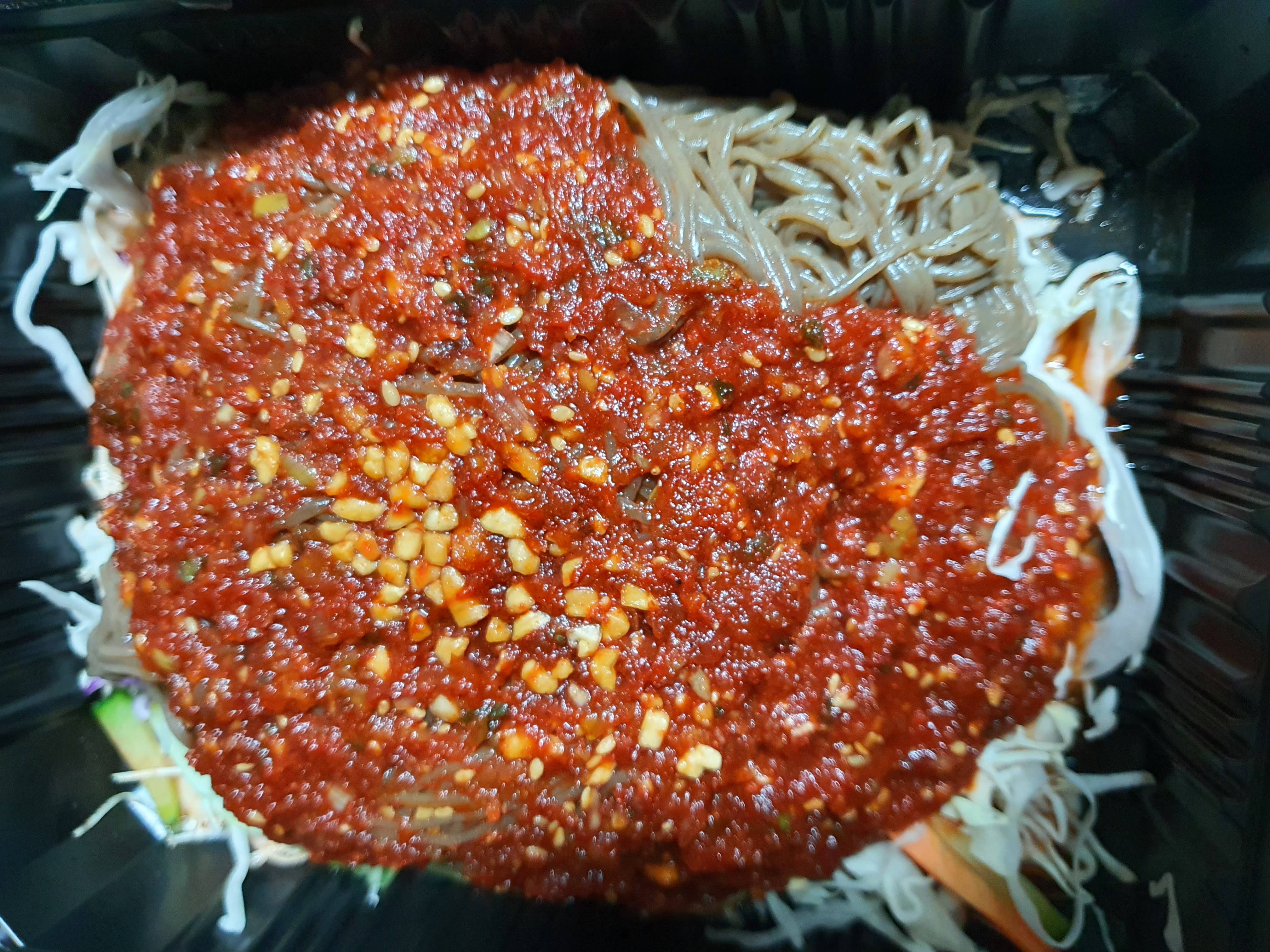 양념이 푸짐하게 올라가 있는 이 음식은 막국수인데 제가 이제 까지 살아보면서 받아본 족발에 끼워주는 막국수 중에 가장 비주얼이 압권이었던 막국수는 이게 처음이었던 듯합니다.