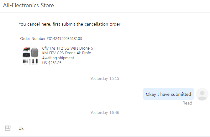 절대로 판매자가 파는 금액과 다른 금액으로 구매를 하도록 유도를 하는 거면 100% 나중에 문제가 될 확률이 있기 때문에 단칼에 거절을 하였는데 이 드론 판매자는 판매를 취소할 수 있으나 그래도 10달러를 추가해준다면 제품을 배송하겠다는 황당한 요구를 계속하게 됩니다.