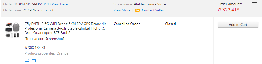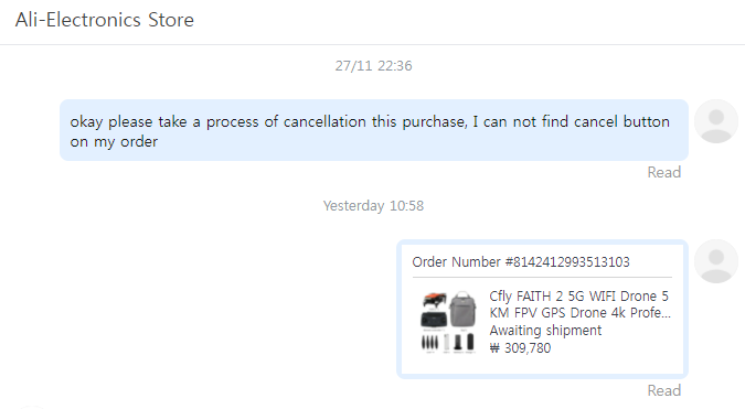 원래 Add to Cart 밑의 저 체크한 공란 부분에 Order Cancel 이란 버튼이 활성화가 되어서 누를 수 있어야 했는데 알리익스프레스의 결제 시스템은 일단 구매자가 판매자한테 대금을 지불하고 제품의 상태가 "Awaiting Delivery"의 단계로 들어가게 되면 판매자랑 구매자 간의 양자 합의가 있어야만 취소가 가능한 시스템으로 이루어져 있습니다.