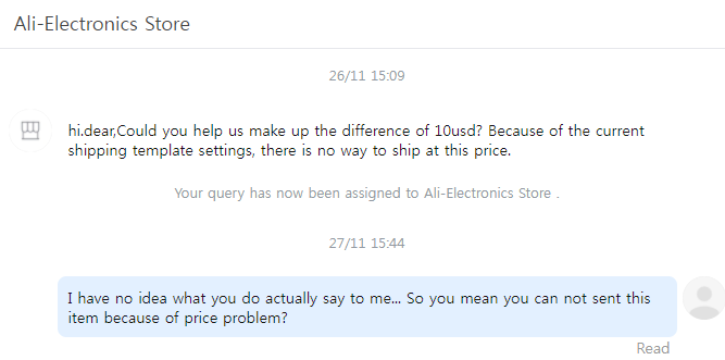 드론을 주문한 다음날인 26일 날 오후에 판매자로부터 자기네들이 현재 올려놓은 판매 금액으로는 판매가 불가능하고 10달러를 더 추가해 달라는 황당한 요구를 합니다.
