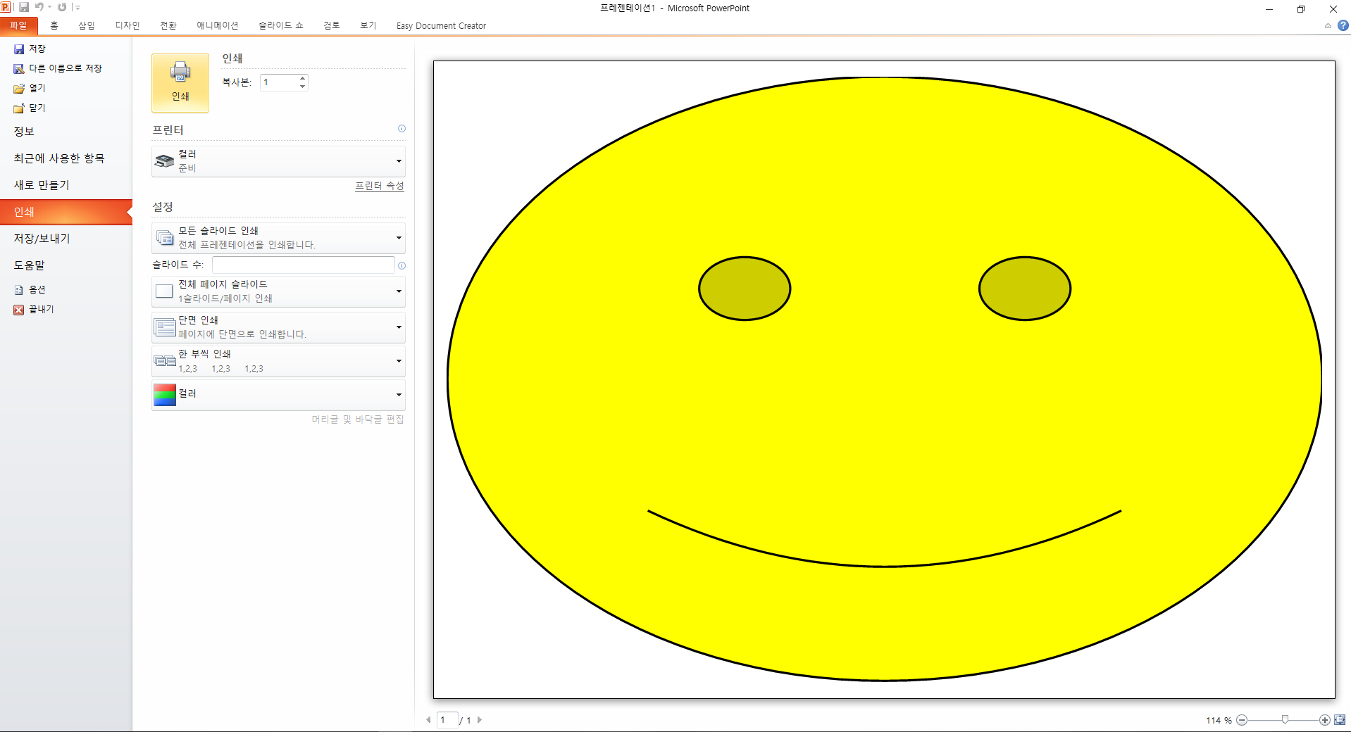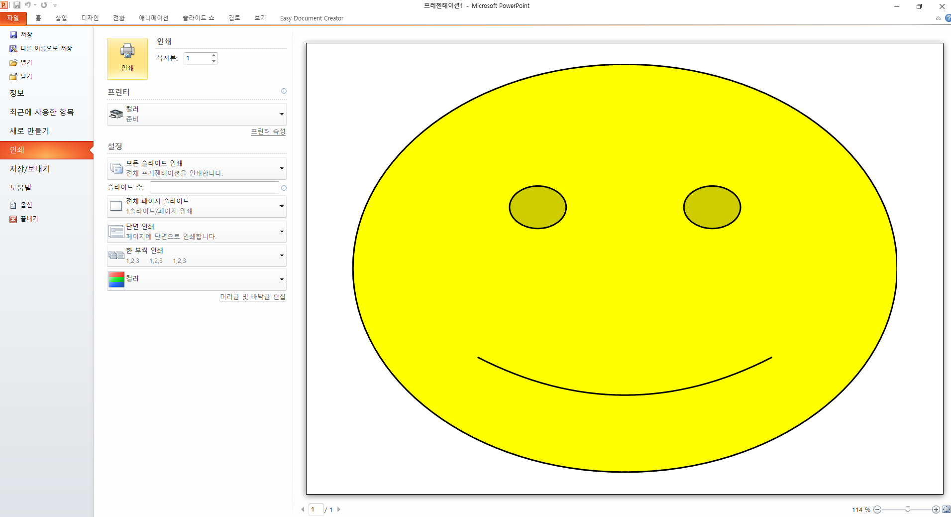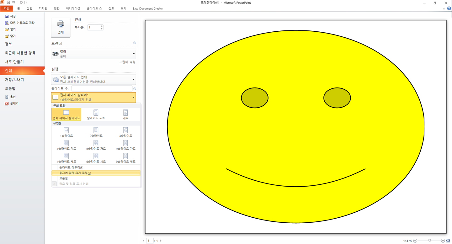 분명 여백 없이 최대한 꽉 채운 스마일 도형이 막상 인쇄를 하려고 보니까 상, 하, 좌, 우 전부 여백이 어느 정도 남아있는 걸 볼 수 있습니다.