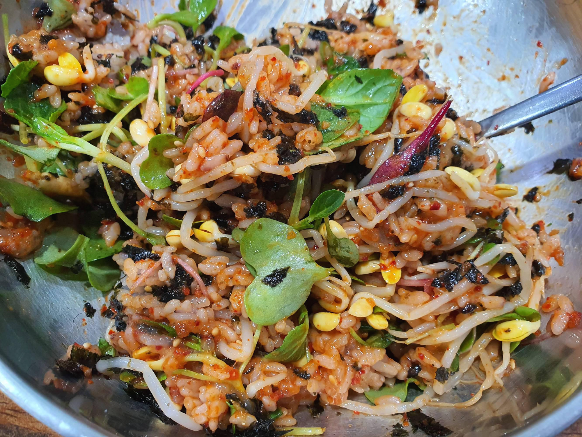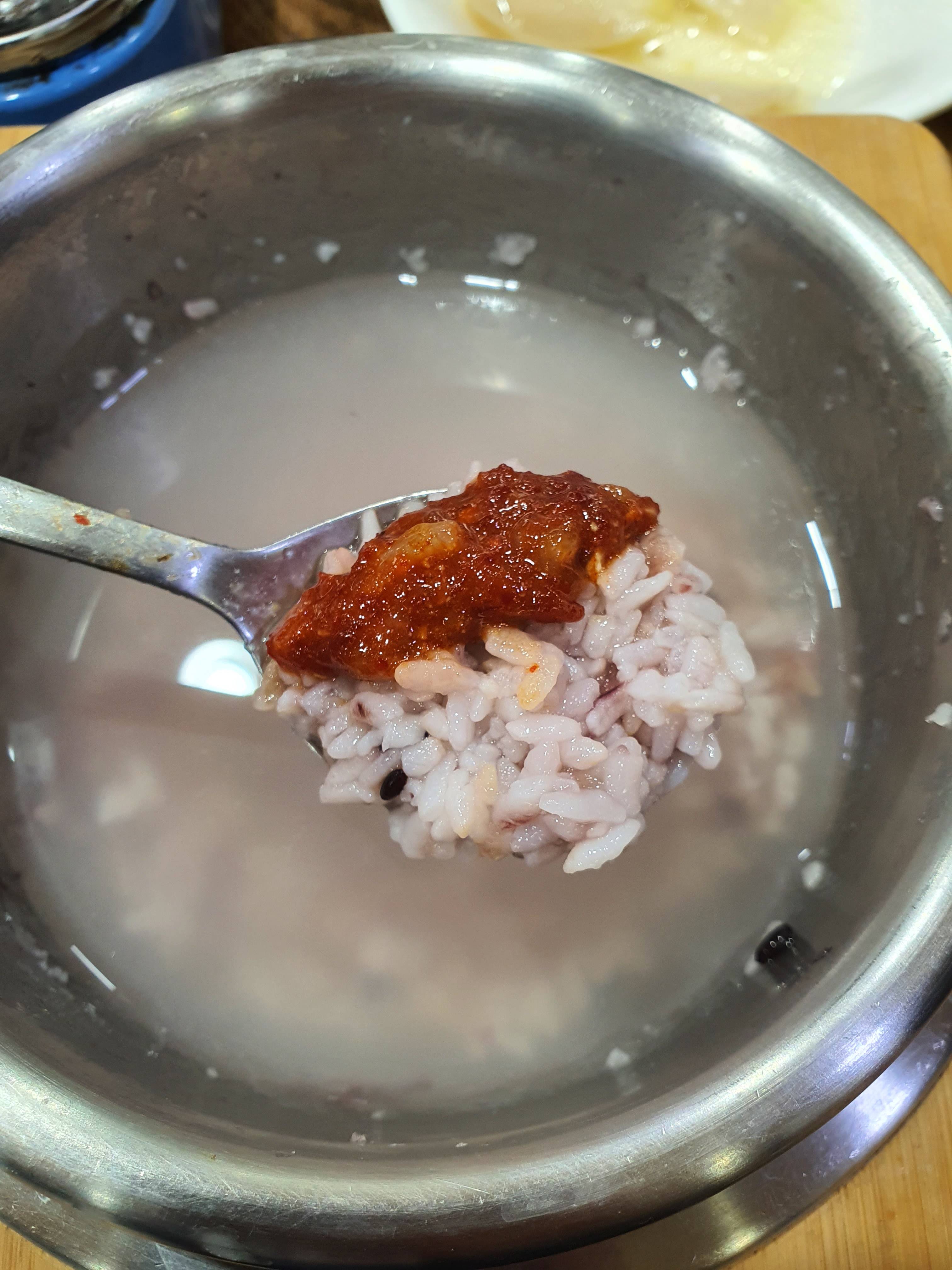 딱히 고추장을 풀지 않았는데도 게살 자체의 양념 때문에 너무 맛난 색깔을 갖게 된 꽃게살 비빔밥의 완성!