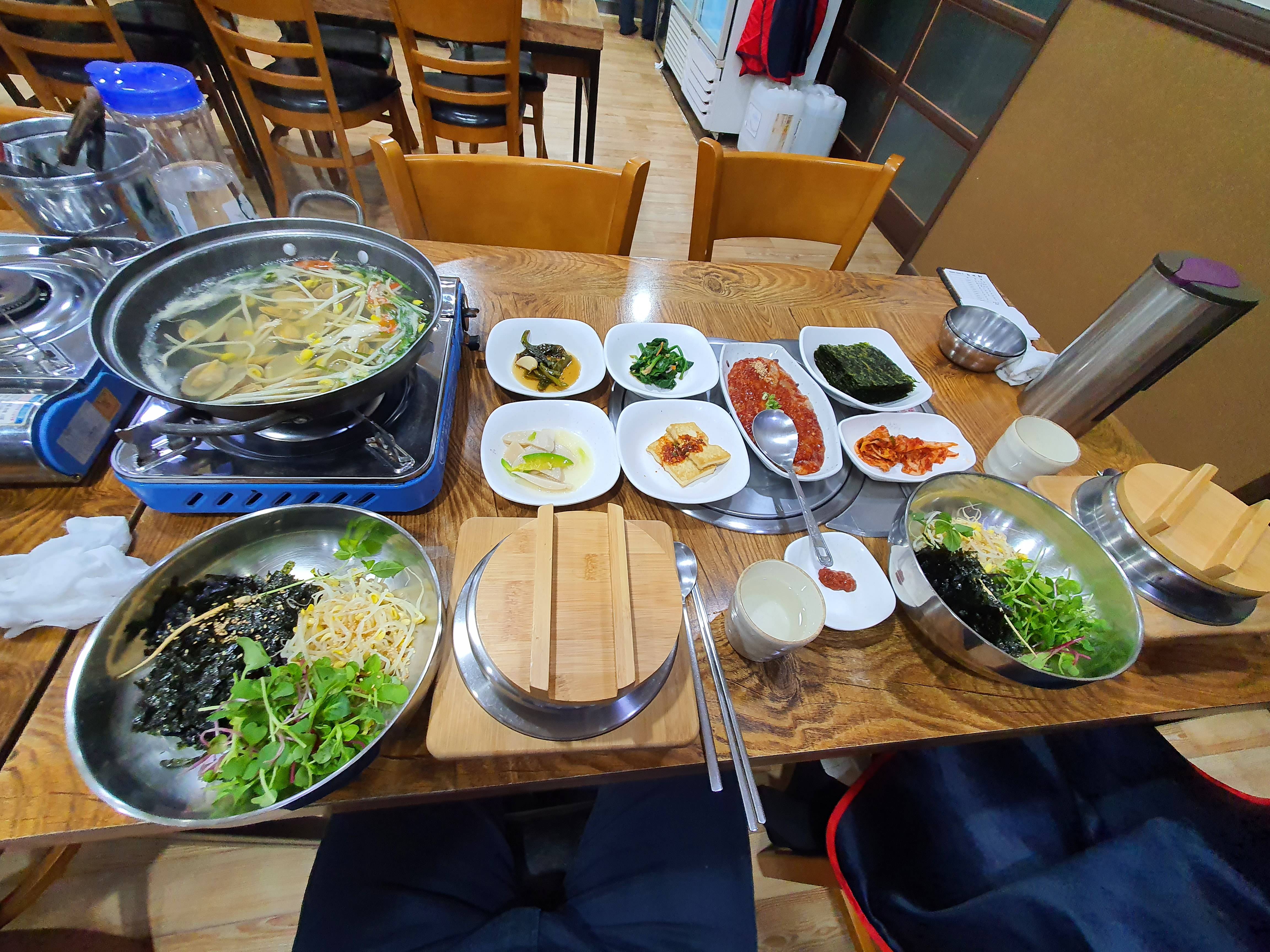 여하튼 김 모락모락 나는 밥을 열심히 퍼서 비빔 나물에 투하해서 열심히 비벼주고 열심히 본식을 먹는 동안 빈 스테인리스 솥밥에는 물을 부어서 누룽지를 만들어 줍니다.