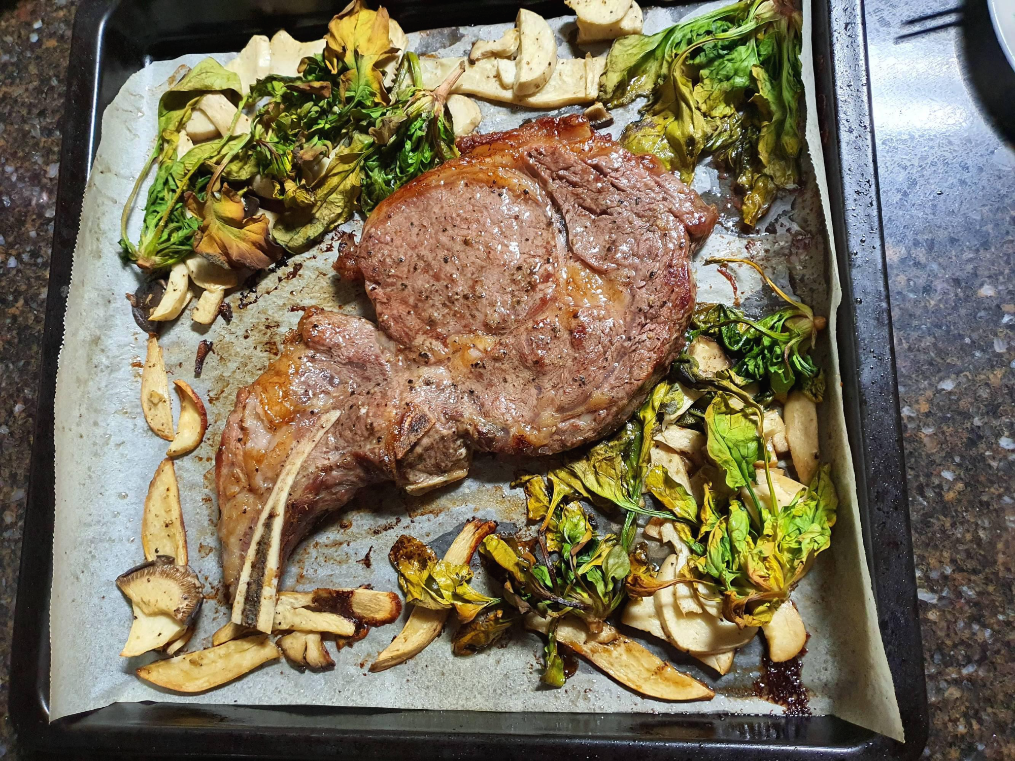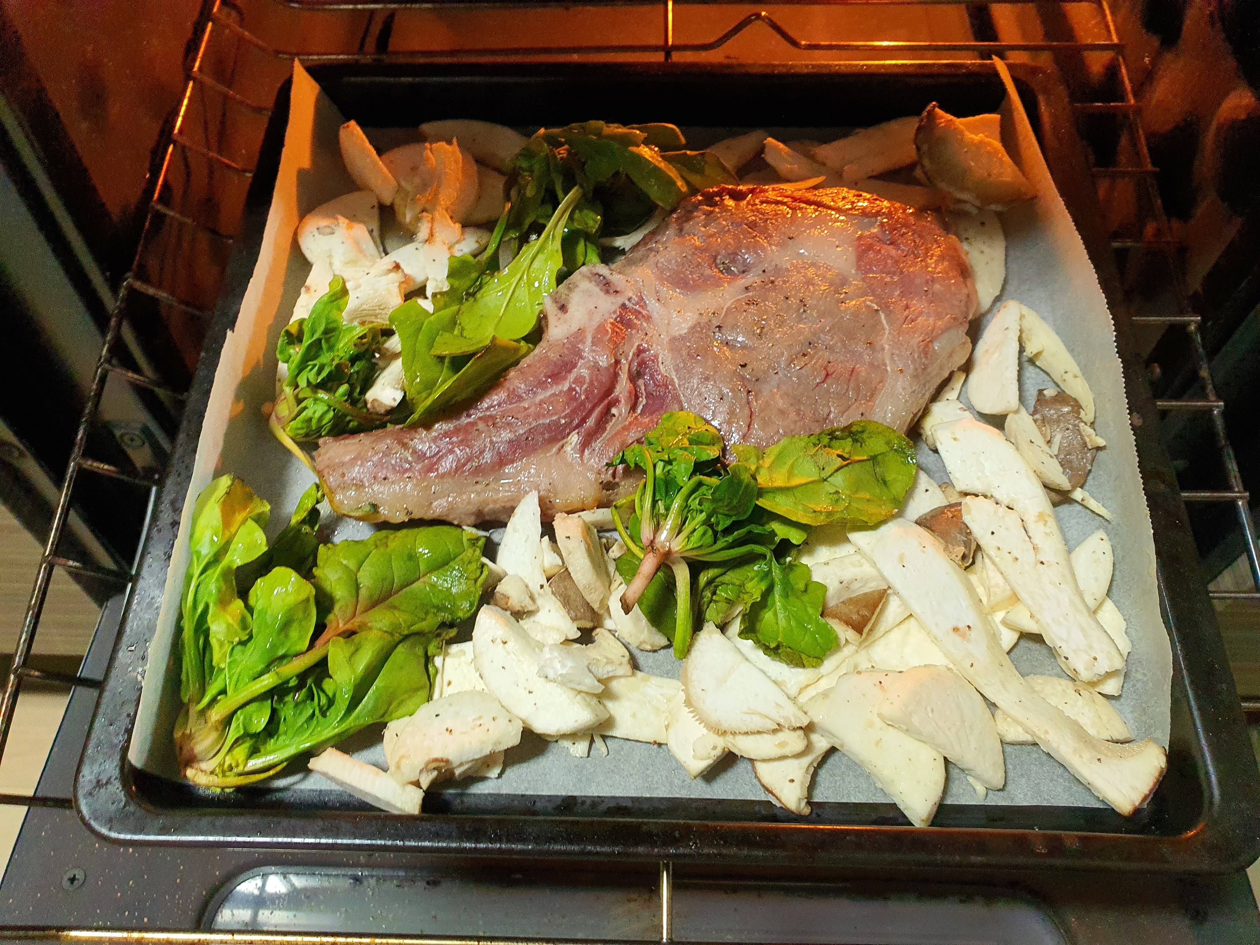오븐에 양념 잘 먹인 토마호크와 새송이버섯과 뭔가 푸른빛이 부족한 듯해서 시금치도 데코를 했습니다.