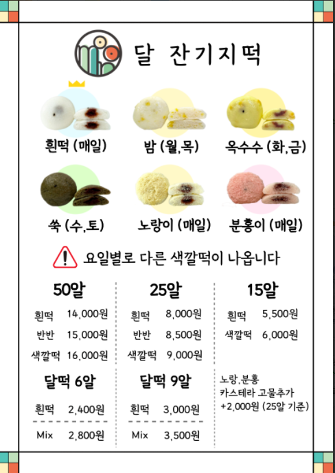 요일별로 다른 떡을 맛볼 수 있는 달 잔기지떡!