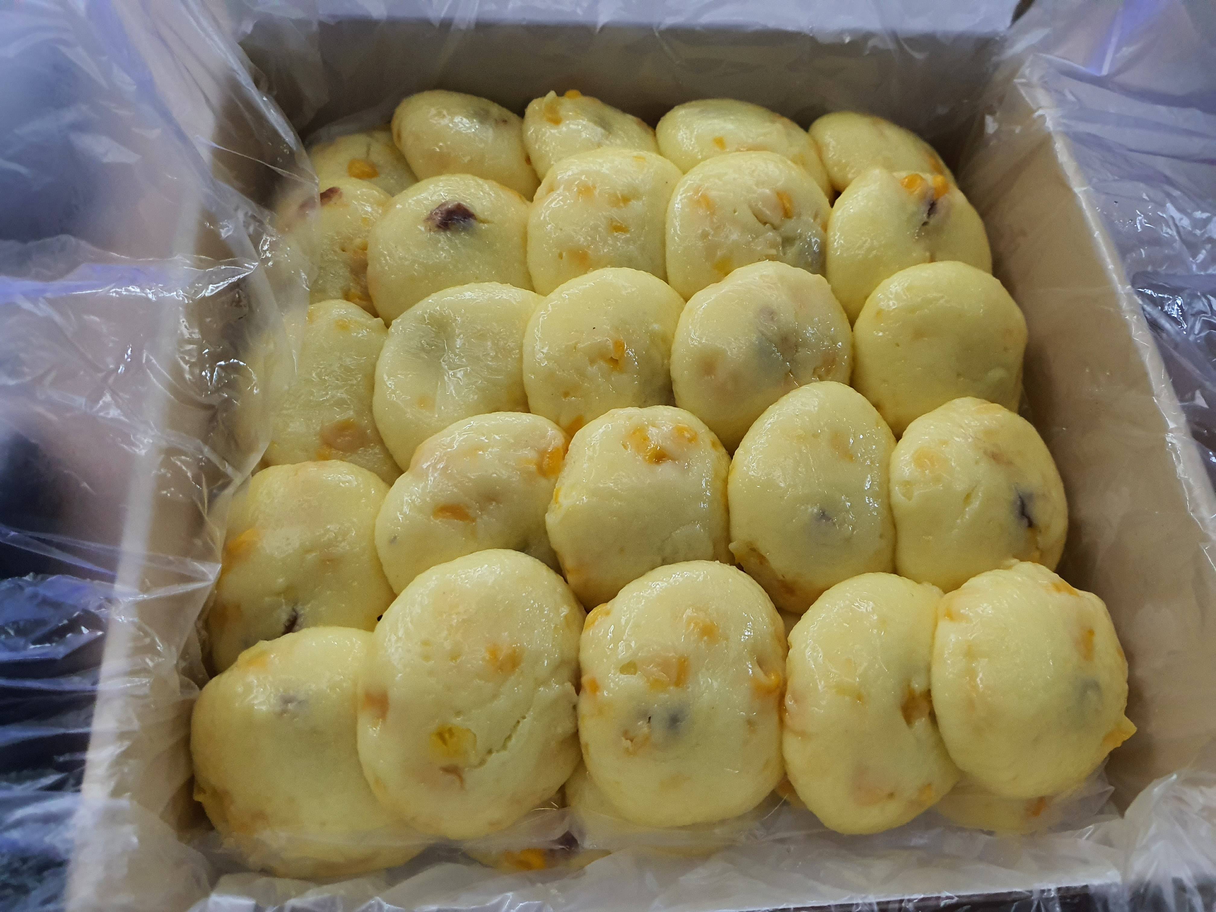 비닐을 다 벗겨내자 참기름 + 옥수수 냄새가 확 풍겨 오면서 노란 자태를 뽐내는 옥수수 떡 50알을 볼 수 있습니다.