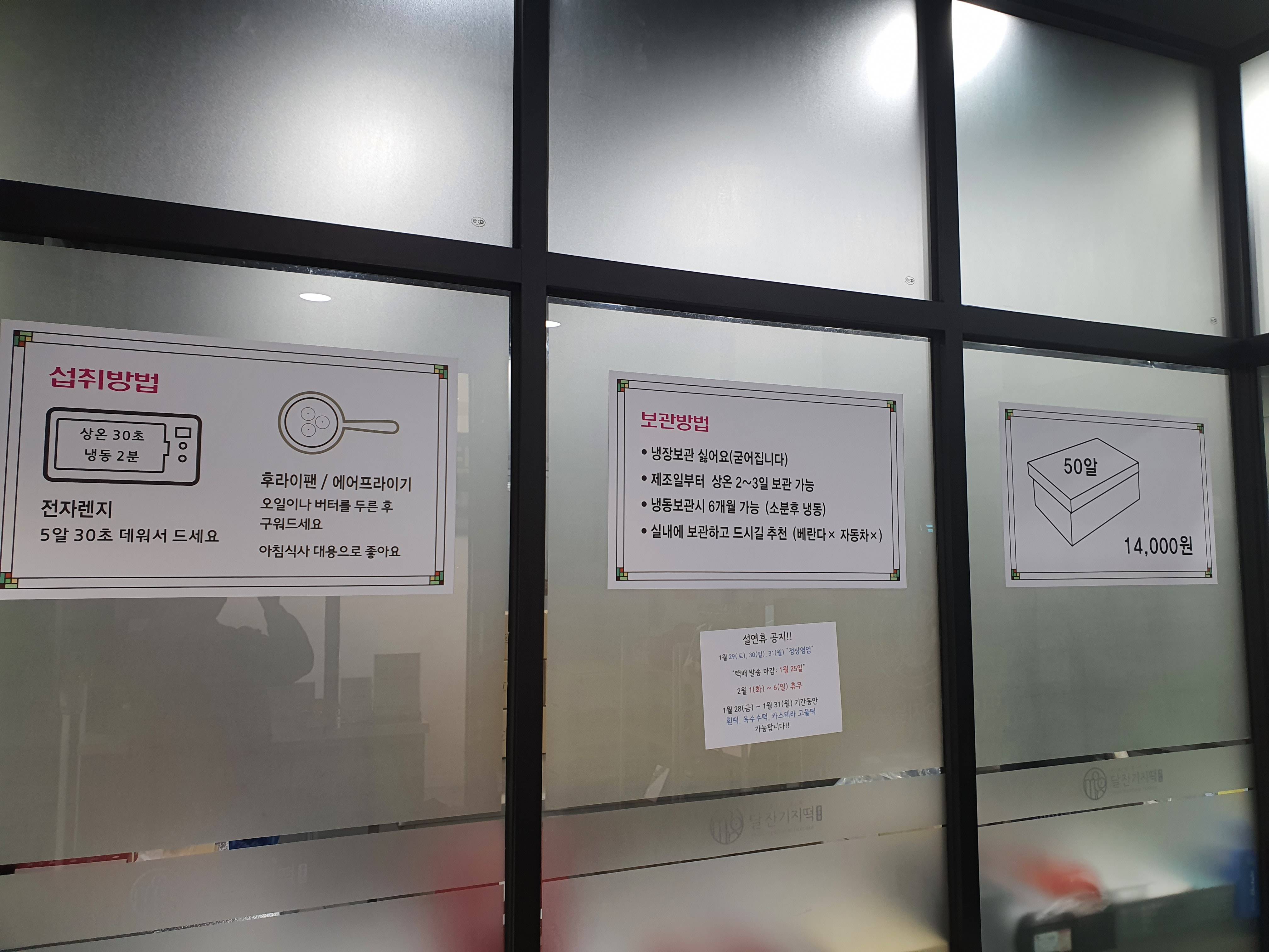 혹시라도 떡을 바로 취식하는 게 아닌 보관 후 조리과정이 필요한 필요한 손님들을 위해서 모든 경우의 수에 해당하는 조리 예를 잘 정리해서 한쪽 유리 벽에 오와 열을 맞춰서 잘 붙여두셨더라고요 ㅋ