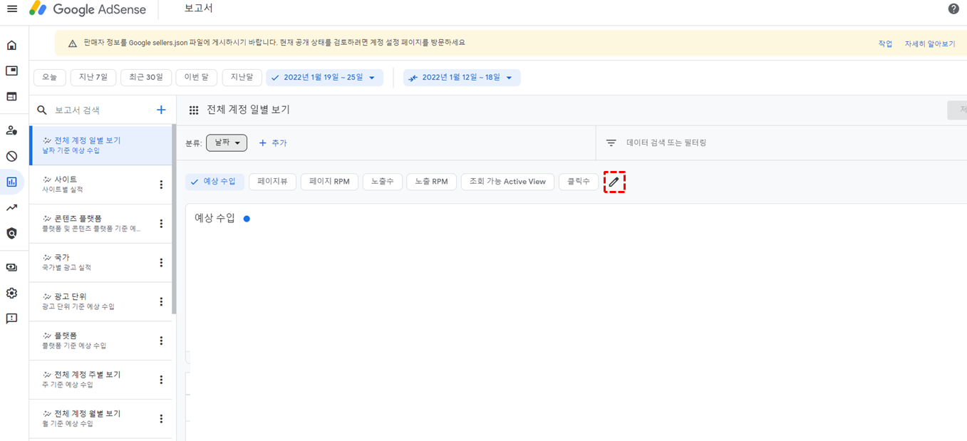 "보고서" 탭을 클릭하고 들어가면 뭔가 어지러운 그래프들이 눈앞에 보이실 건데 저희는 CPC 단가를 확인해야 하기 때문에 그래프 중앙 위쯤에 있는 저 "연필 모양" 아이콘을 클릭해 줍시다.