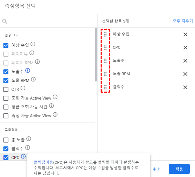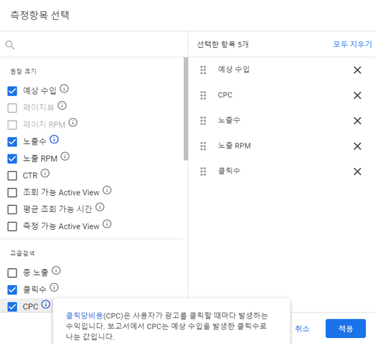 여기서 본인이 보고자 하는 메뉴만 골라서 보는 게 가능하며 우리는 CPC 단가를 확인해야 하니, "CPC"라는 글자 앞의 체크박스를 클릭해 줍시다.