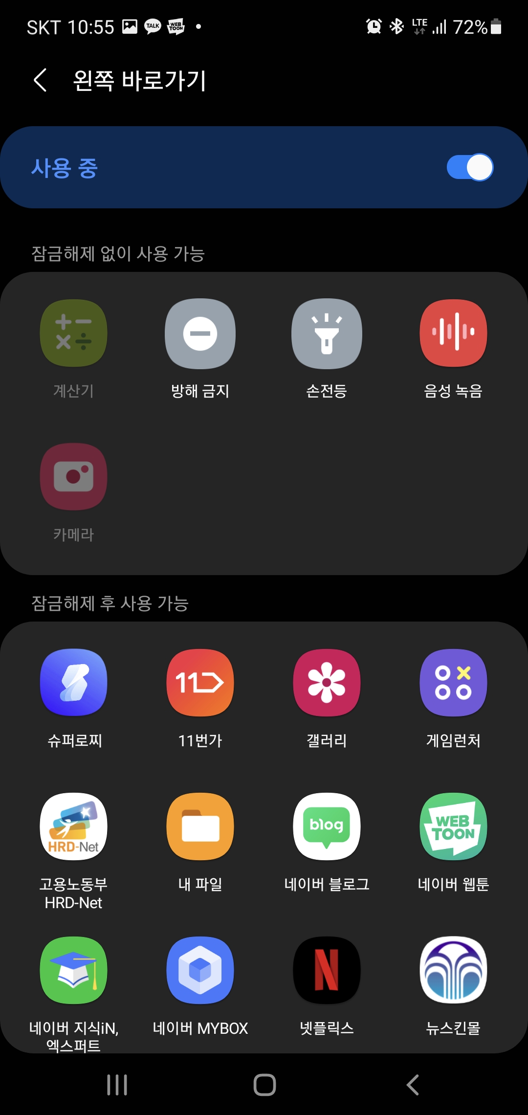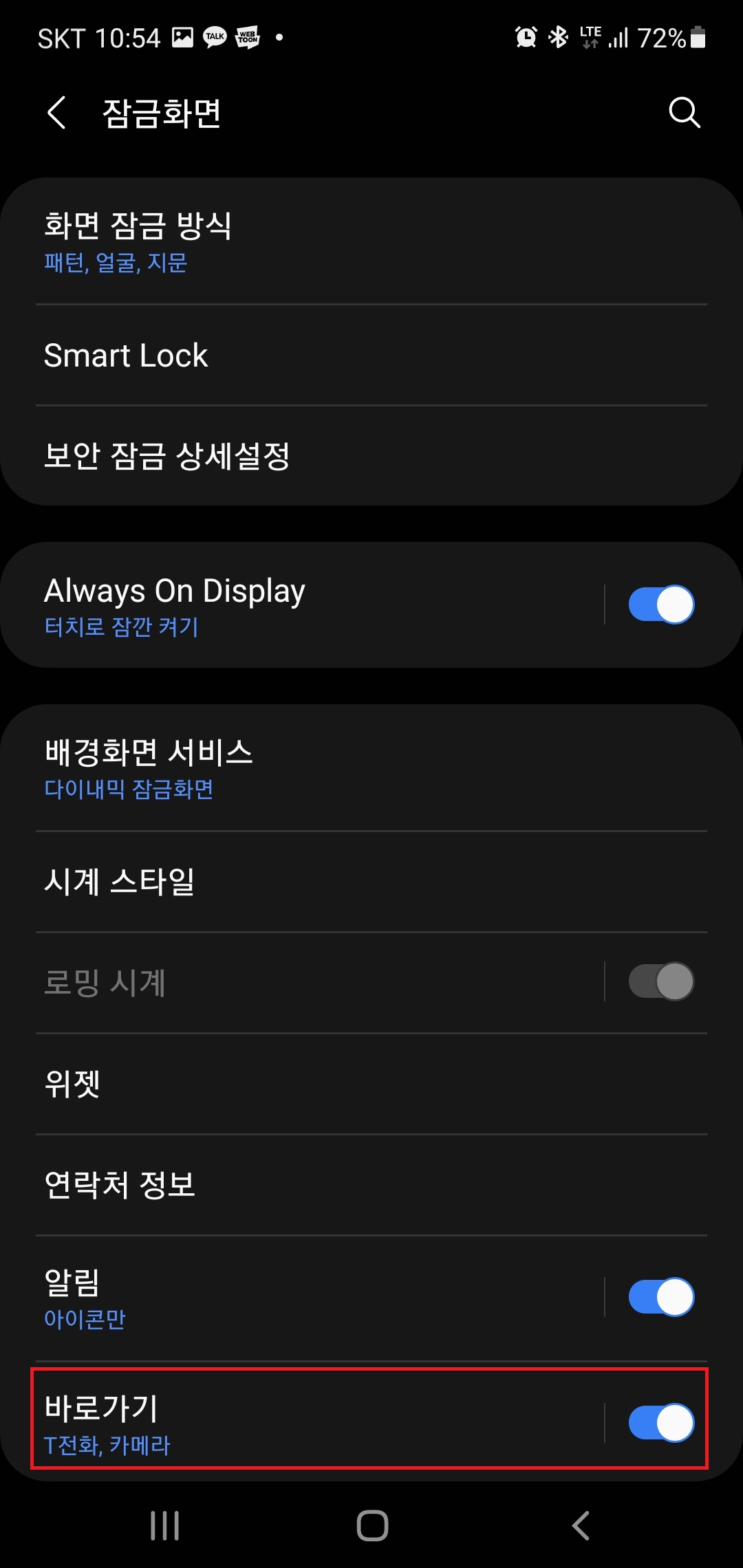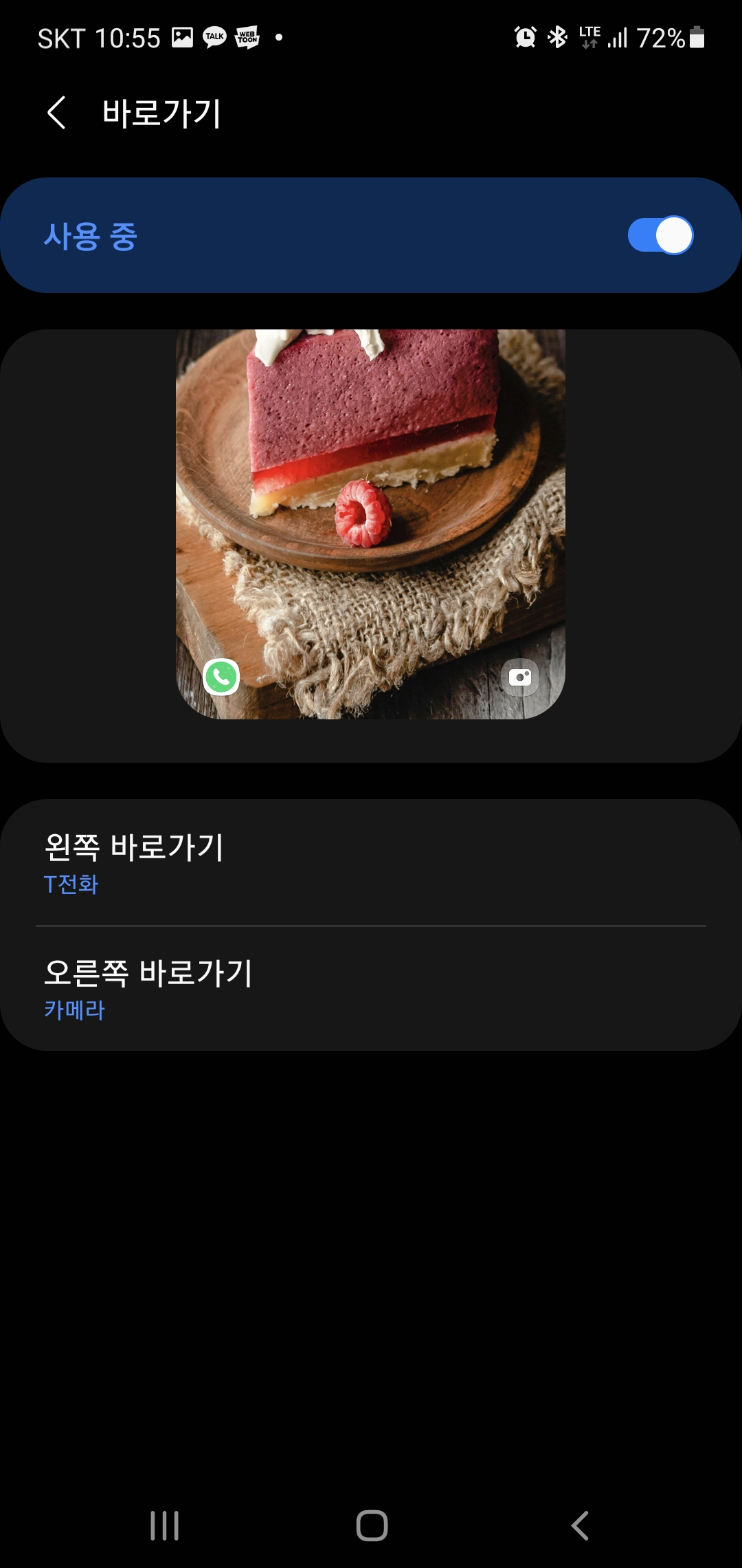 제 노트 10 기준으로는 기본으로 설정되어 있는 잠금화면의 바로가기 앱은 T전화와 카메라입니다.
