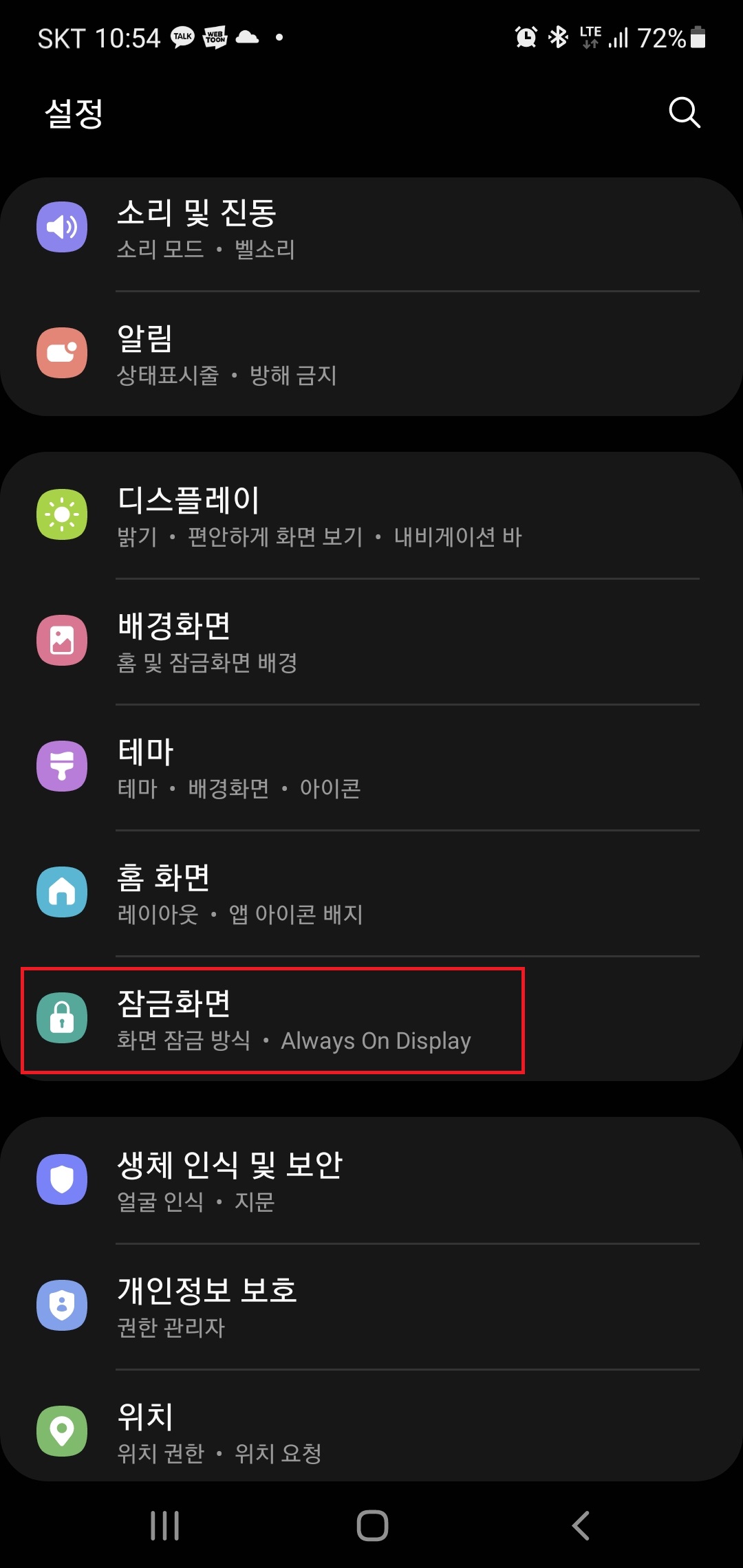 첫 번째, "설정" 메뉴로 들어가서 "잠금화면" 탭으로 넘어가 줍시다.