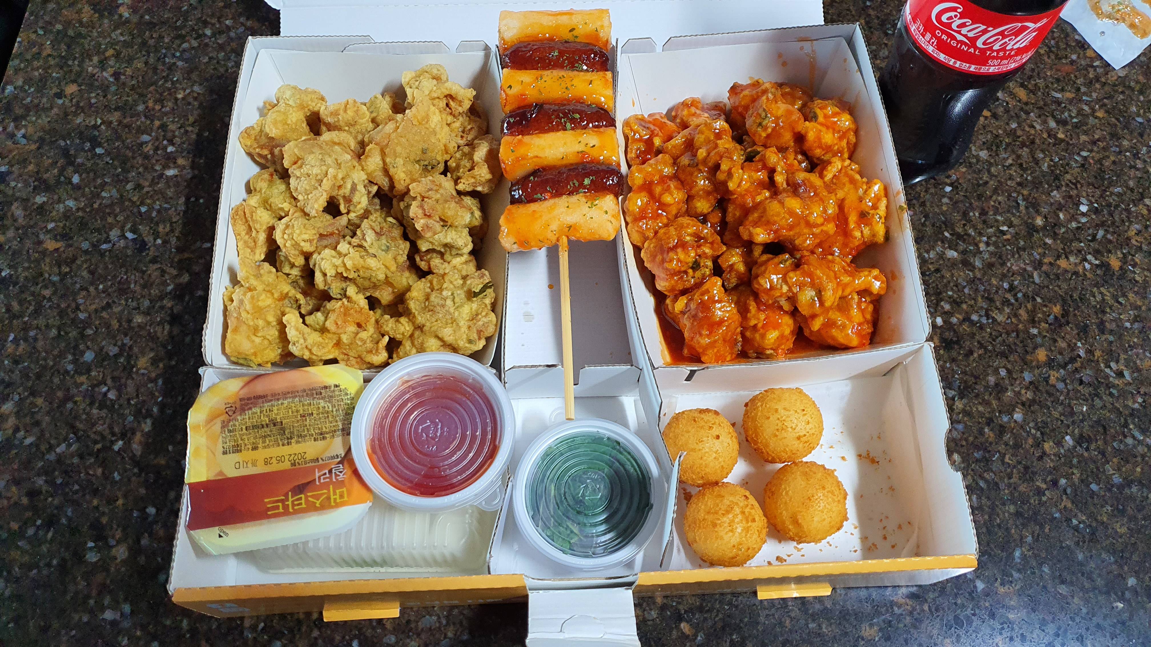 좌 순살 후라이드, 우 순살 양념과 가운데에서 밸런스를 잡고 있는 소떡소떡이 너무 잘 어울리는 듯합니다.