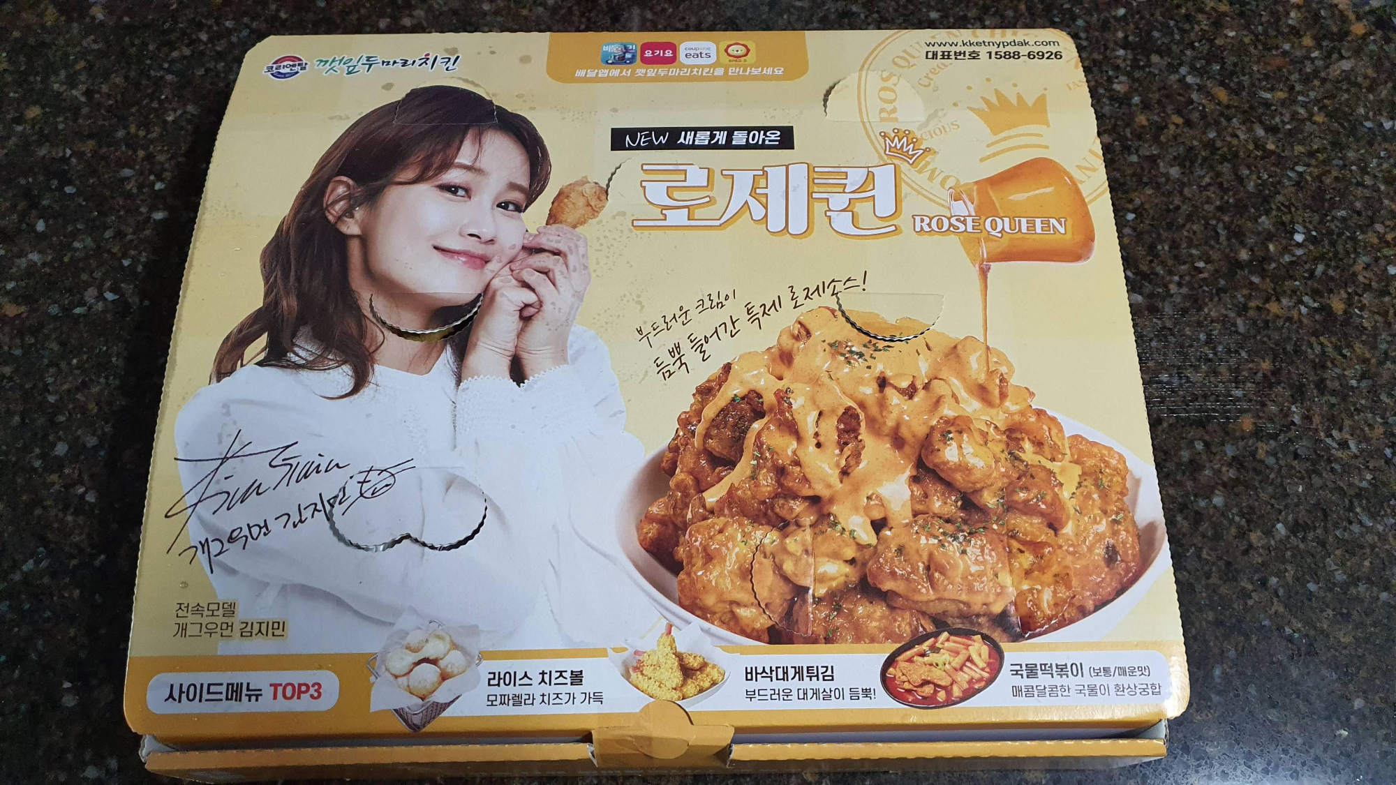 개그우먼 김지민씨가 큼지막하게 프린팅 된 포장 상자에 치킨이 한가득 담겨서 방문포장해왔습니다.