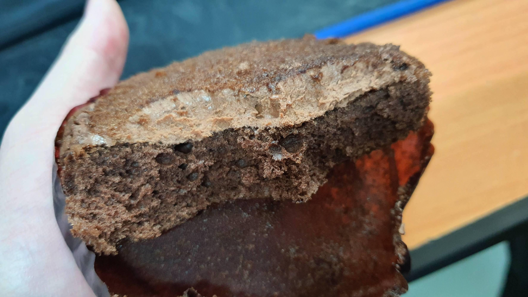 한쪽 머핀빵을 먹은 뒤 초코 크림의 두께를 한 번 봤는데요.