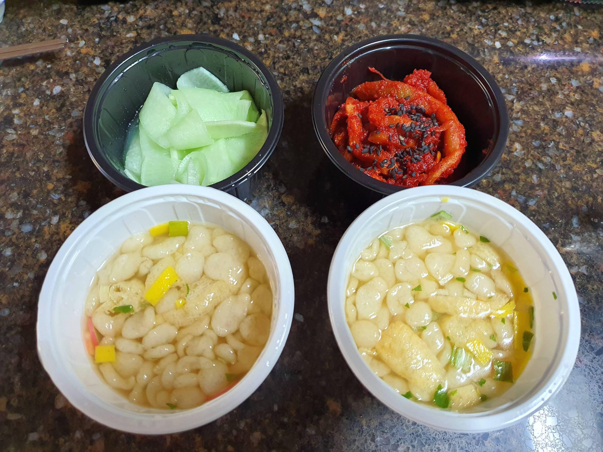 유부가 한껏 들어간 우동국물 2세트와 쌈무 그리고 짠지입니다.