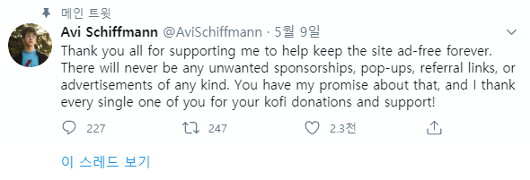 상기 후원 사이트의 도네이션을 통해서 "Avi Schiffmann"에게 소정의 후원이 가능하니 관심 있으신 분은 커피 한잔 사 먹을 돈 후원 정도는 어떨까 싶네요.