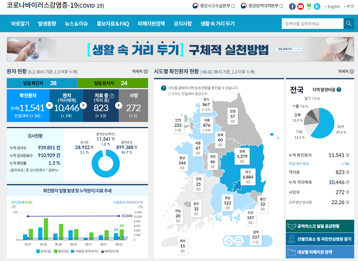 한국에서는 한국 질병관리 본부와 정부가 직접 운용하는 국내 코로나 바이러스 감염 현황을 매일같이 업데이트해주는 사이트입니다. 국내에 굉장히 특화되어 있으며, 필요시 국외 관련 정보도 열람할 수 있게끔 정말 편리하게 잘 만들어진 사이트 입니다.