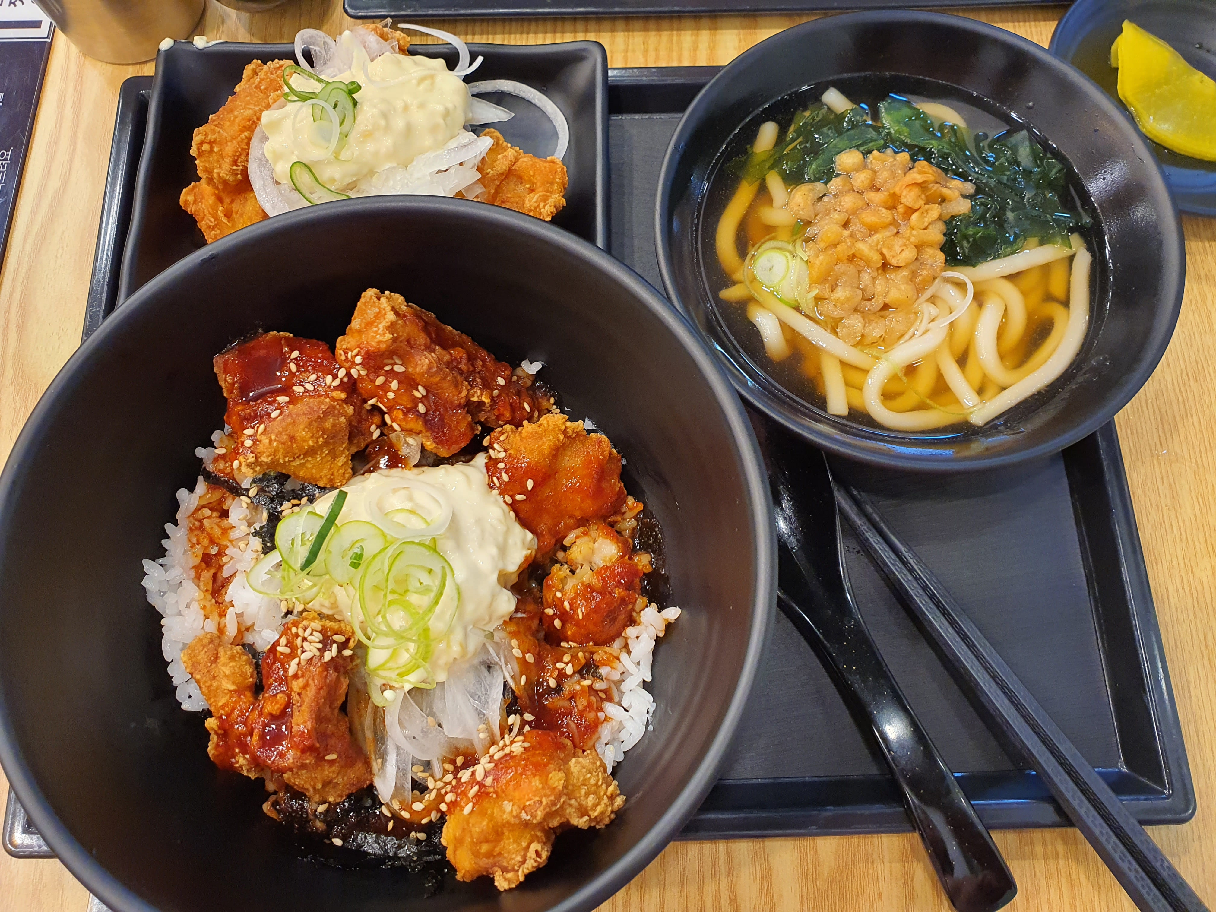 내무부장관님이 주문하신 매콤치킨마요 덮밥 우동세트와 사이드 메뉴로 주문한 양파마요 치킨입니다.