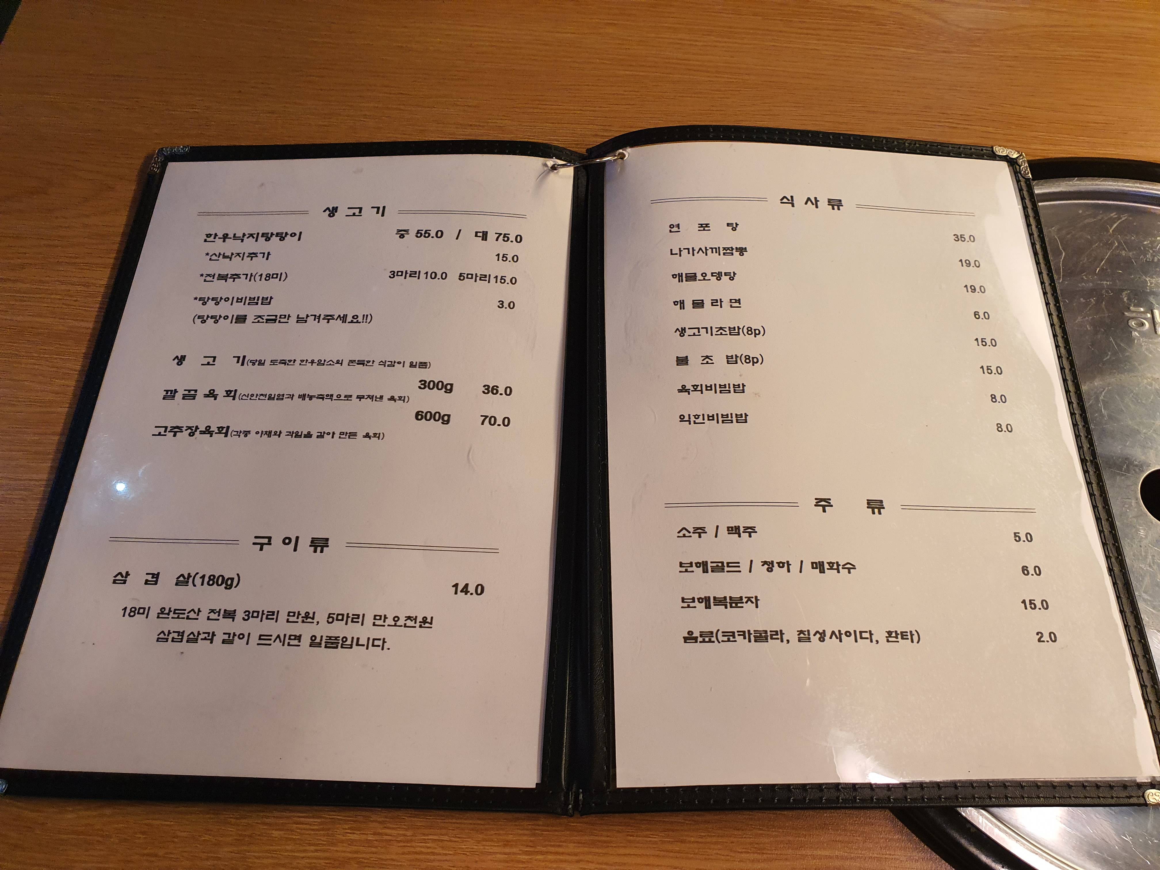 메뉴판에 보이다시피 여러 메뉴가 있습니다만 생고기랑 한우 낙지 탕탕이가 정말 맛있는 곳입니다.