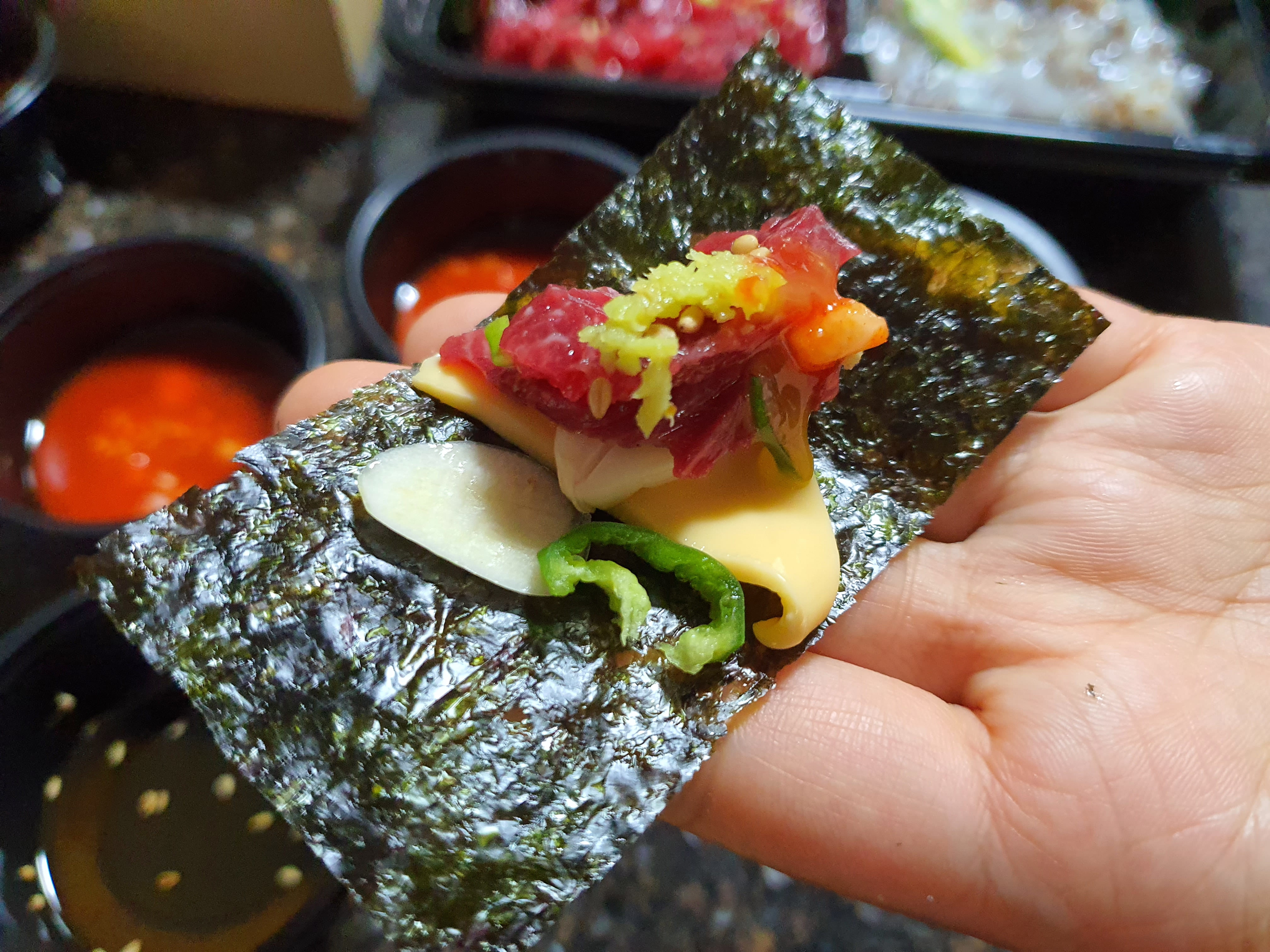 계란 노른자 물을 찍은 육회 한 점을 올리는 게 최고의 쌈 조합 같습니다.