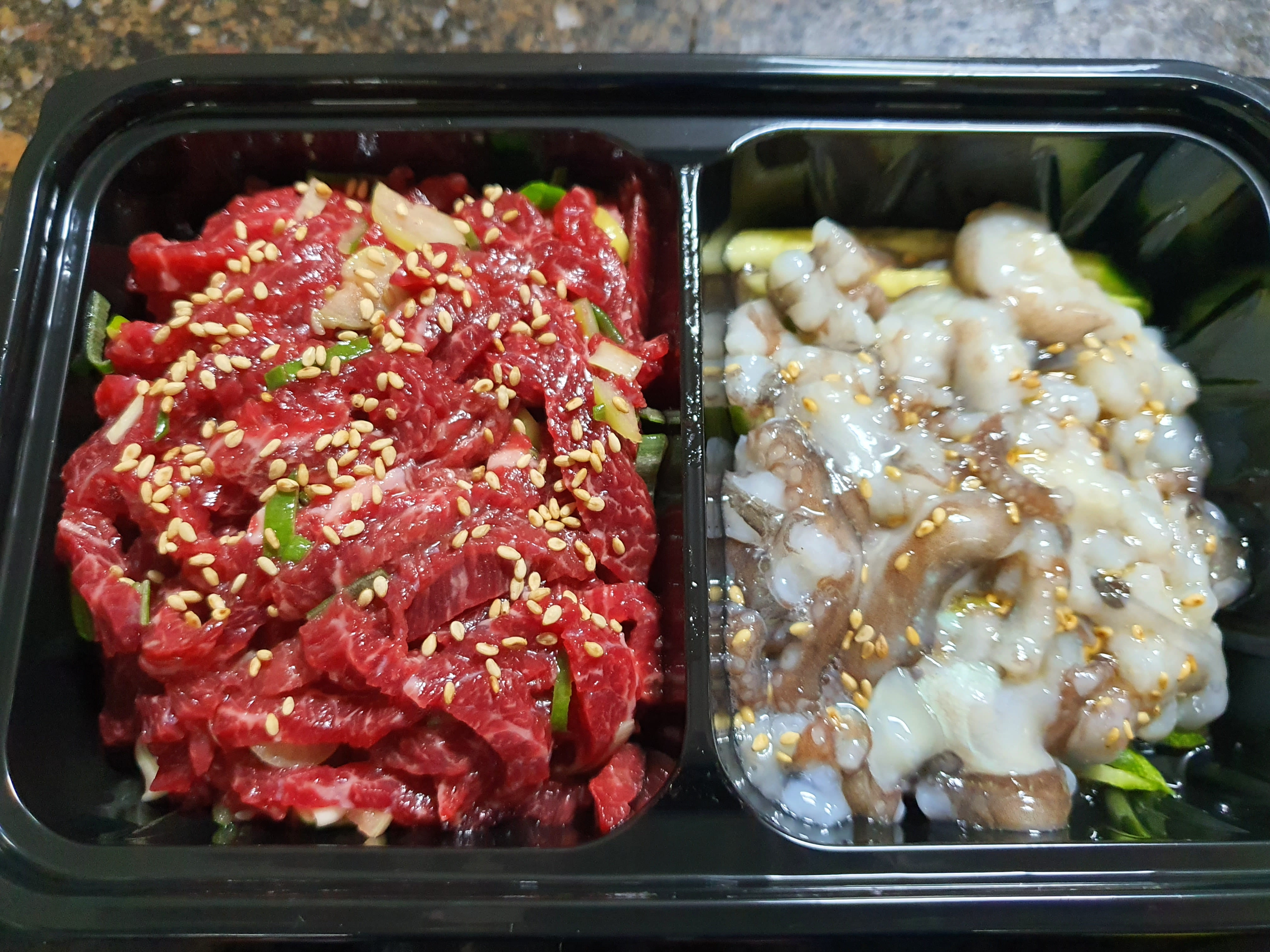 메인이자 본체인 깔끔육회 200g 용량 분과 낙지 탕탕이의 비주얼입니다.