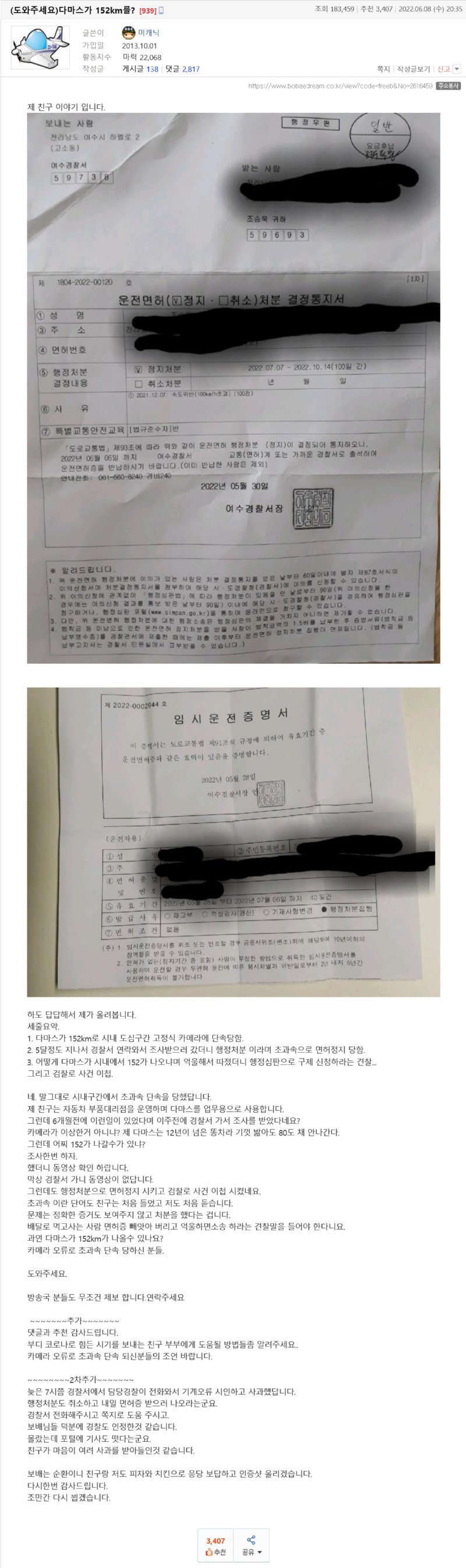 지난 6월 8일날 자동차 전문 커뮤니티인 보배드림에 올라온 원글입니다.