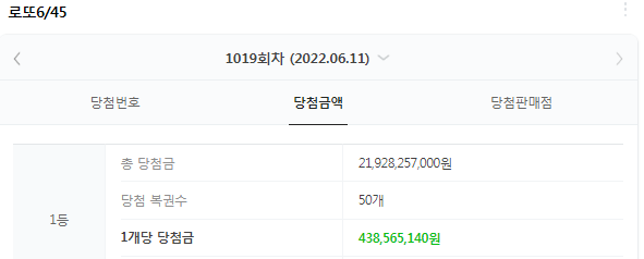 1019회 차 로또의 1등 당첨금액은 438,565,140원이었습니다.
