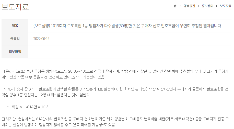 참고로 로또 1등의 당첨확률은 8,145,060분의 1의 확률로 "0.00001288%"라고 합니다.
