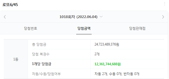 참고로 그 전 차수인 1018회 로또의 당첨금액은 아래와 같습니다.