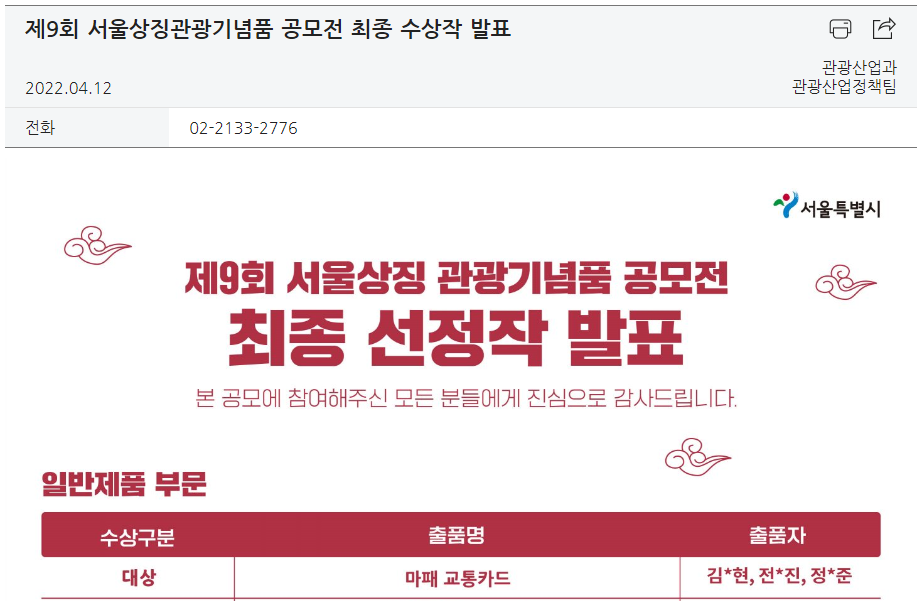 그리고 최종 올해인 22년도 4월에 마지막 공고가 발표된 "제9회 서울상징 관광기념품 공모전"에