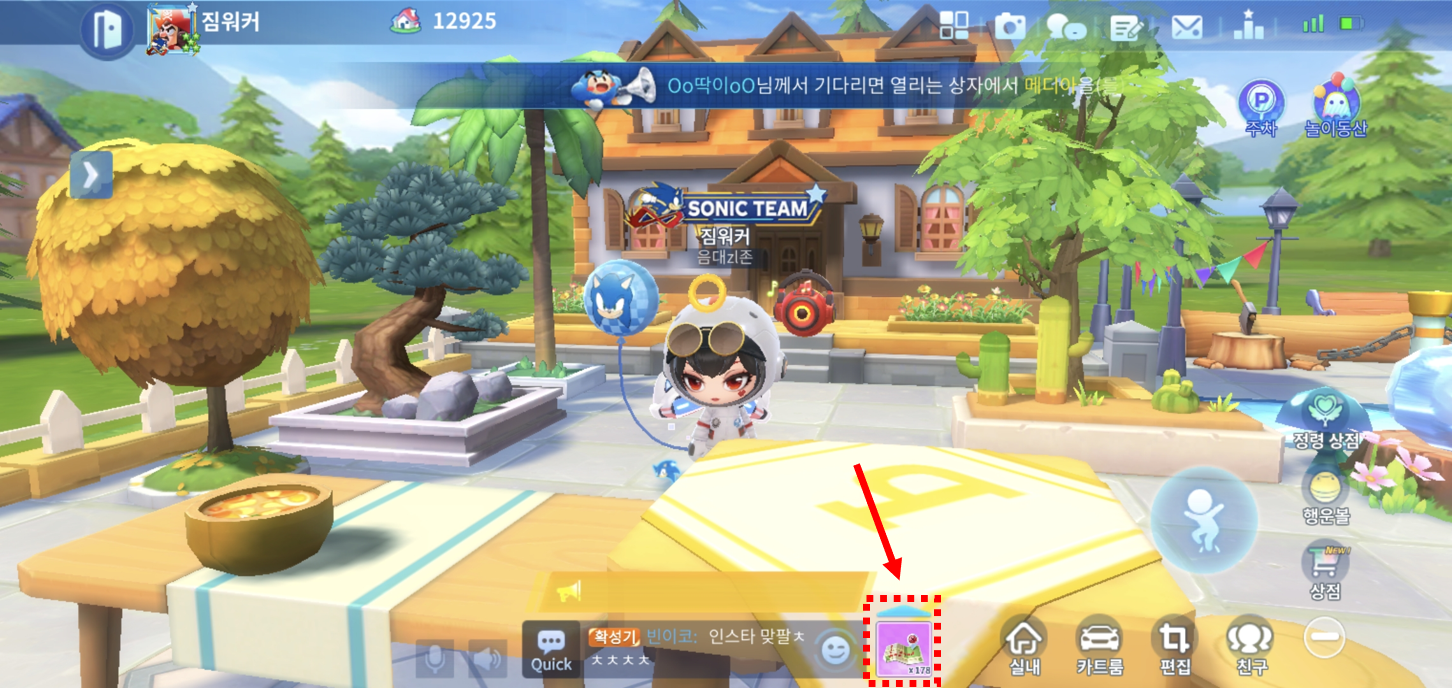 마이룸을 입장한 다음 화면 중앙 하단 채팅창 바로 우측에 있는 지도 같은 아이콘이 있는