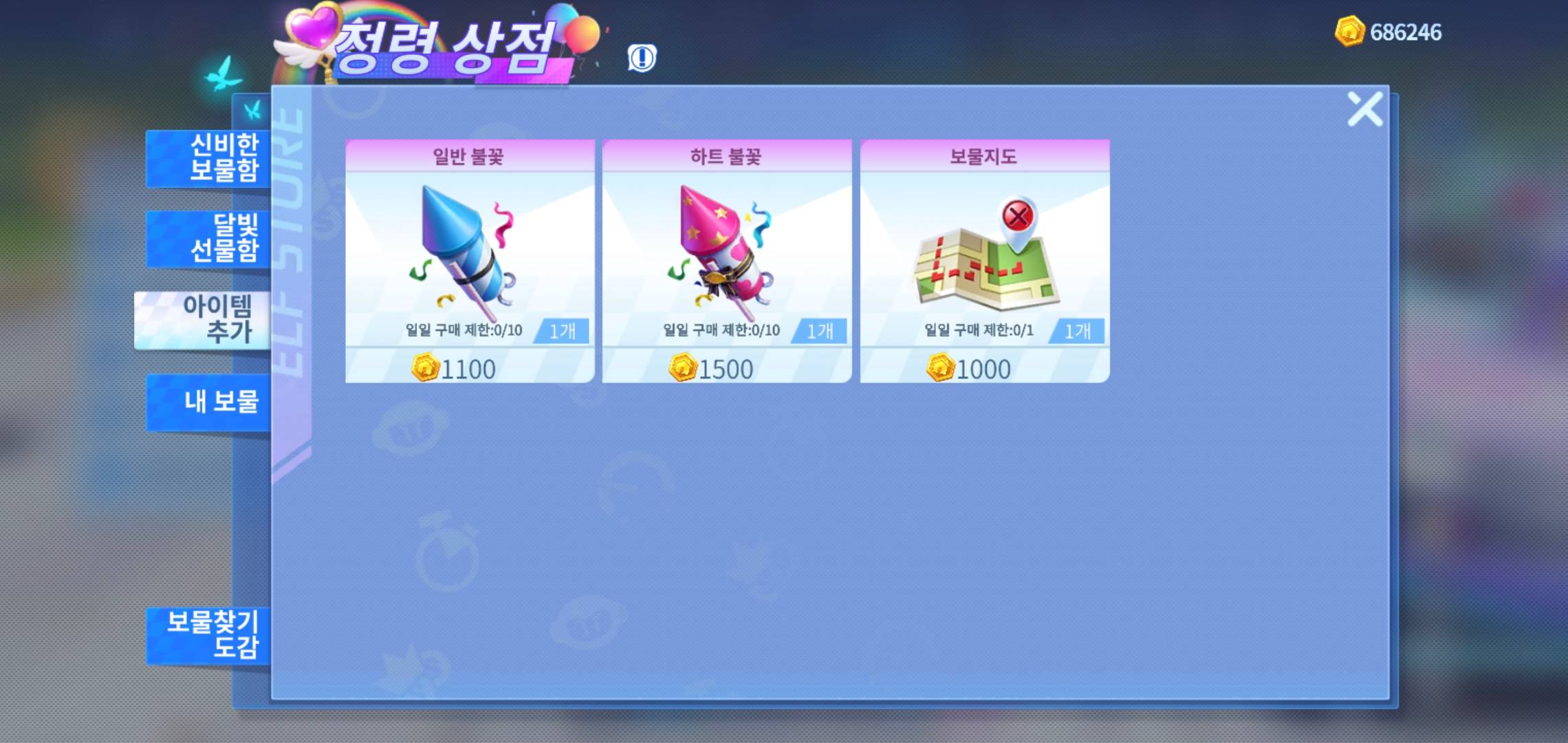 참고로 "정령 상점"->" 아이템 추가" 탭에서 현실 시간 하루에 한 번씩 보물지도를 구매할 수도 있습니다.