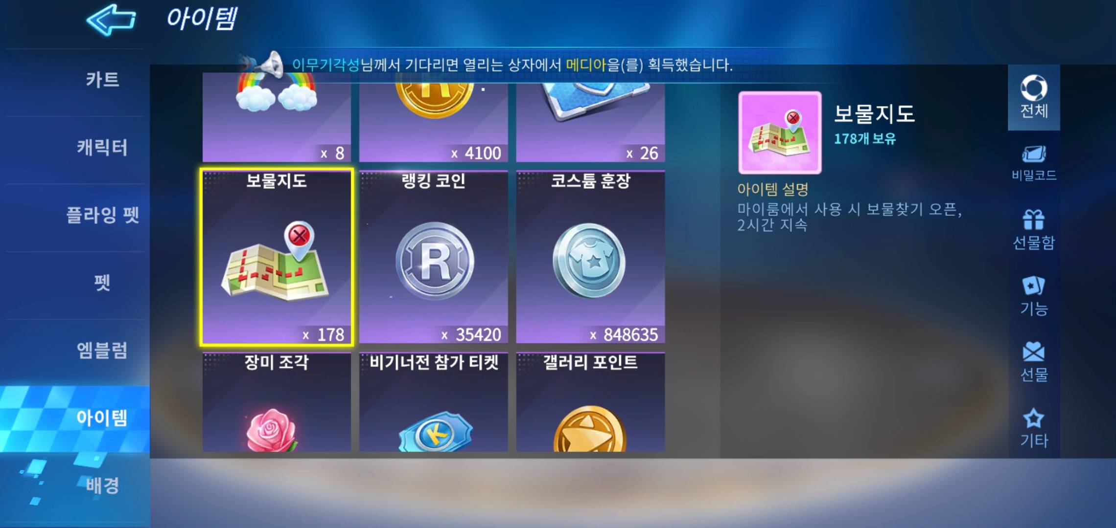 본인이 보유하고 있는 보물지도의 수량을 확인하려면 메인 화면의 캐릭터 대기 창에서 창고를 누르고
