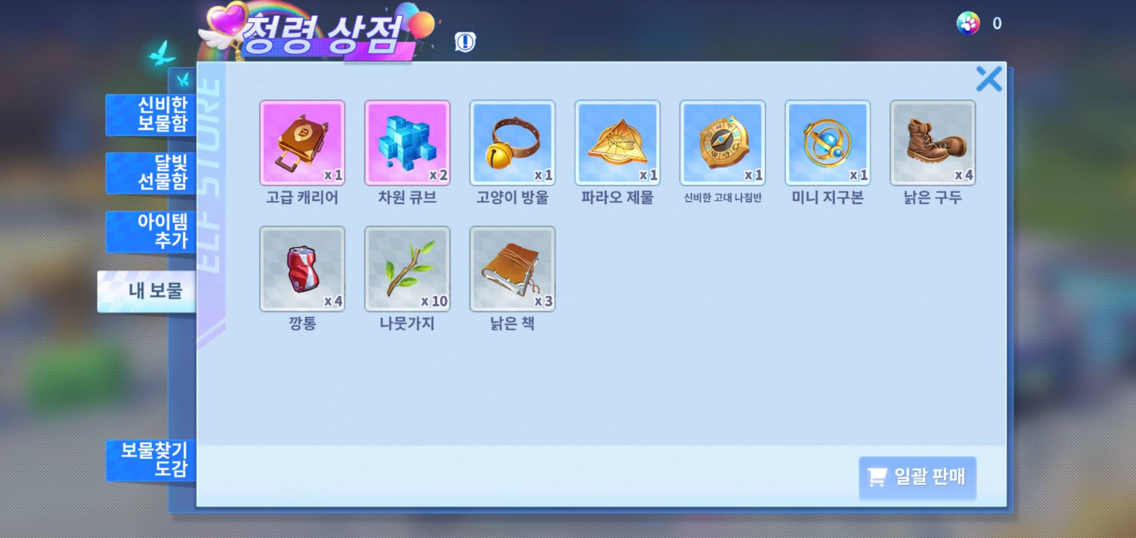 보물 찾기를 통해서 얻은 아이템들은 "정령 상점"이라는 아이콘을 누르고