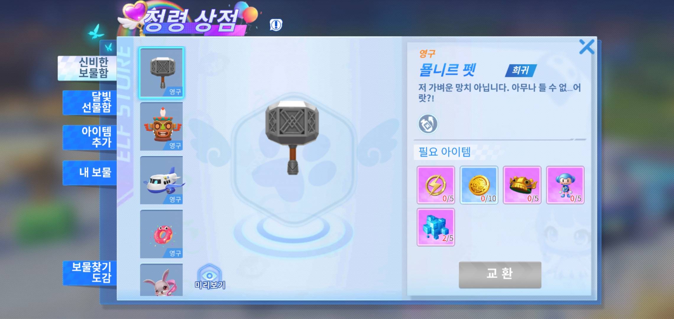 여기서 모은 아이템으로 신비한 보물함에 있는 아이템의 재료 아이템으로 교환을 할 수도 있으며,