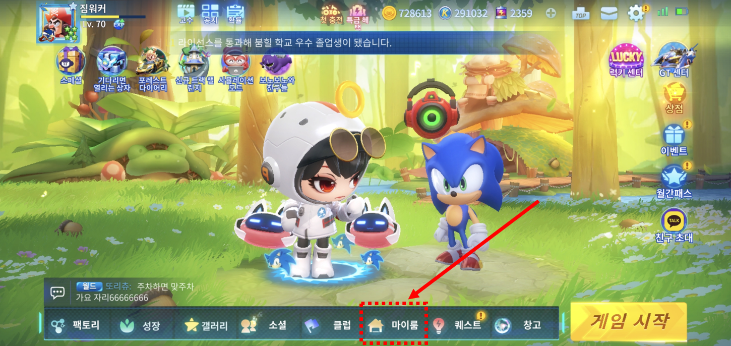 일단 메인 화면의 캐릭터 대기 창에서 "마이룸"을 들어가 줍시다.