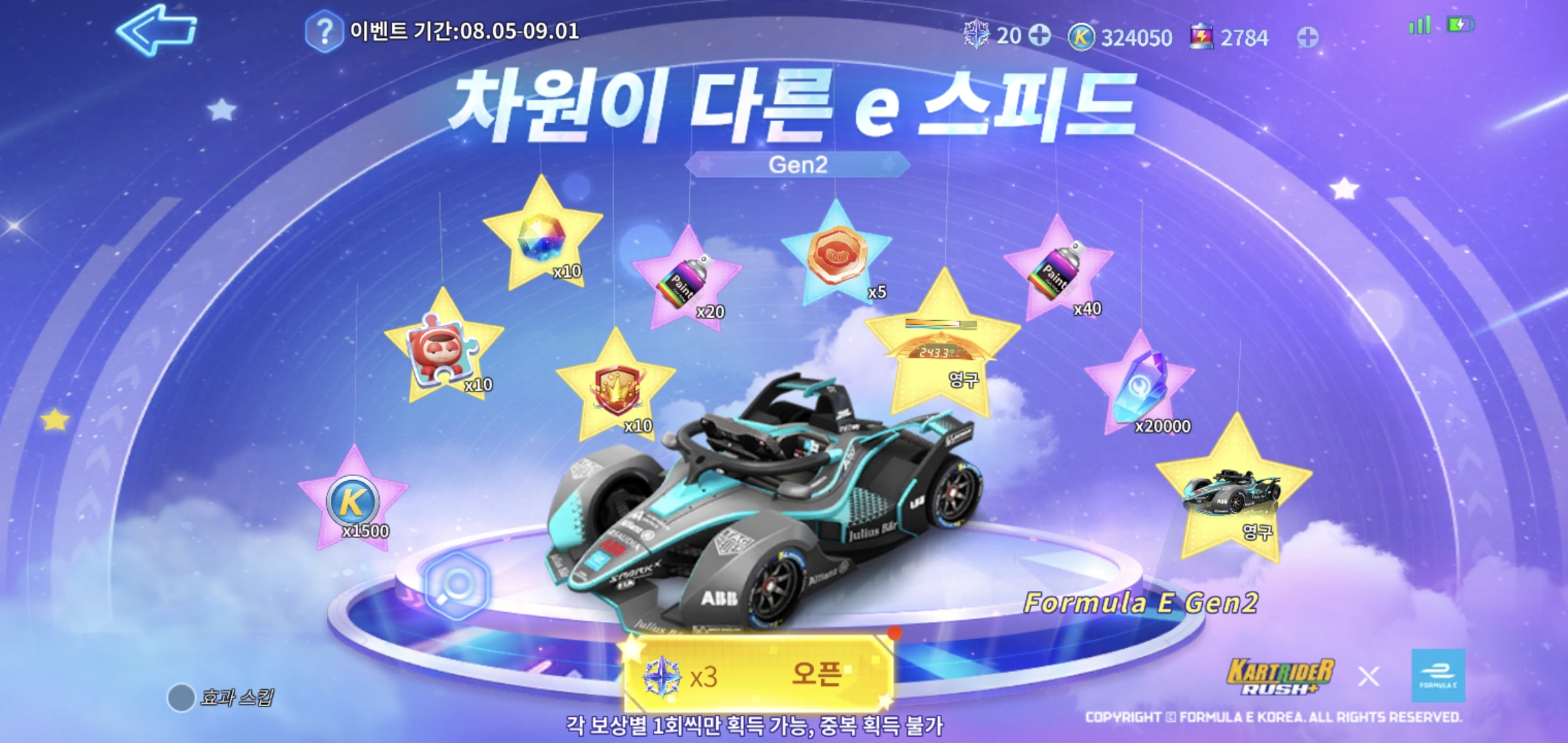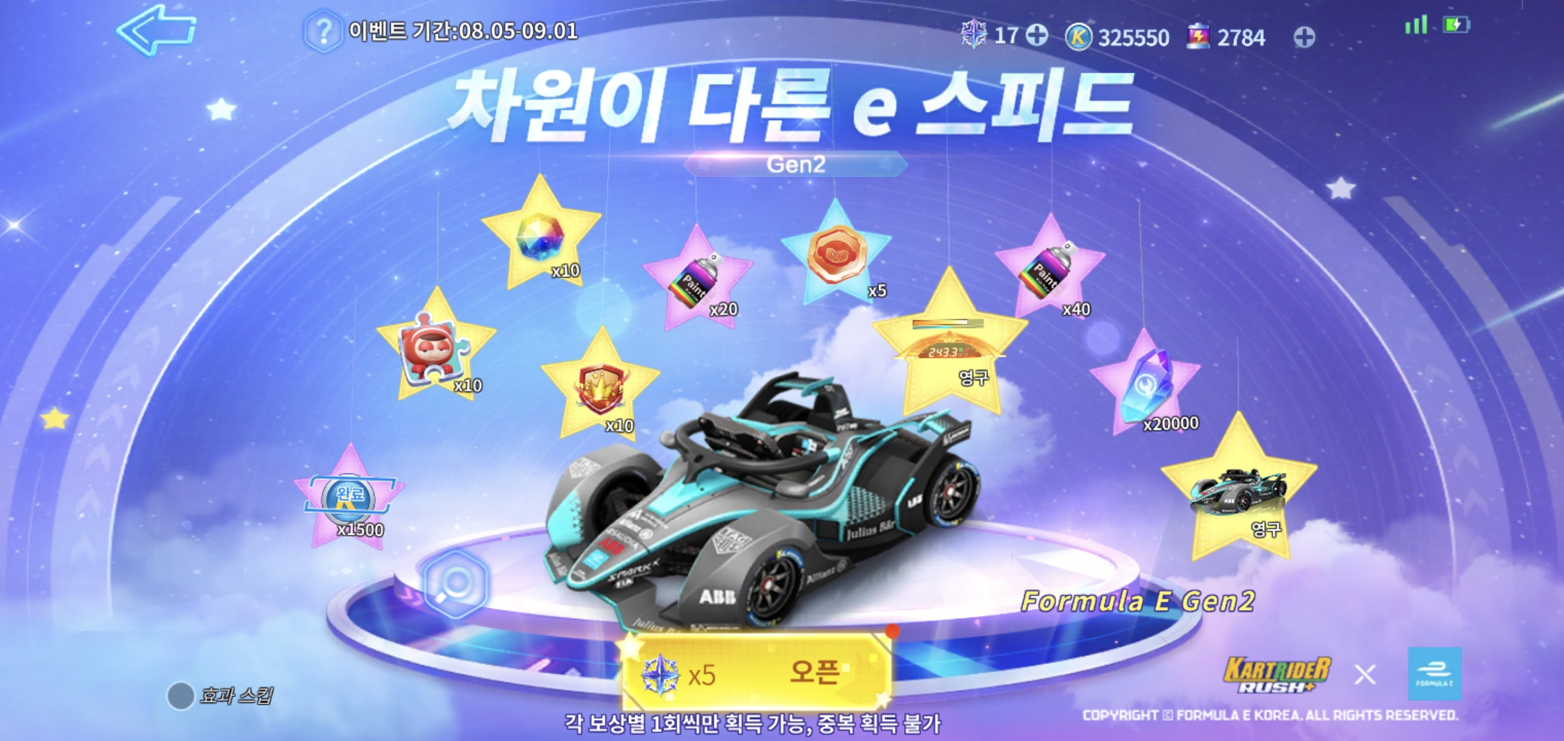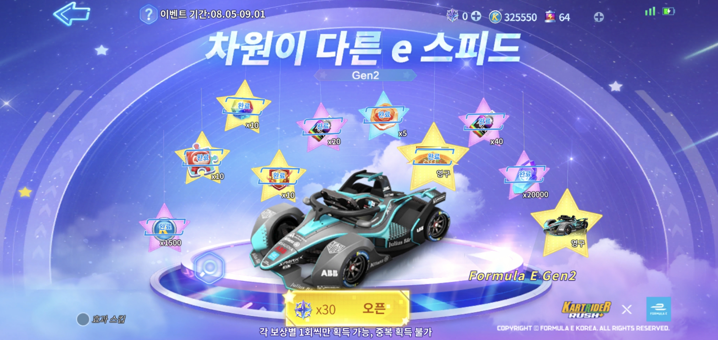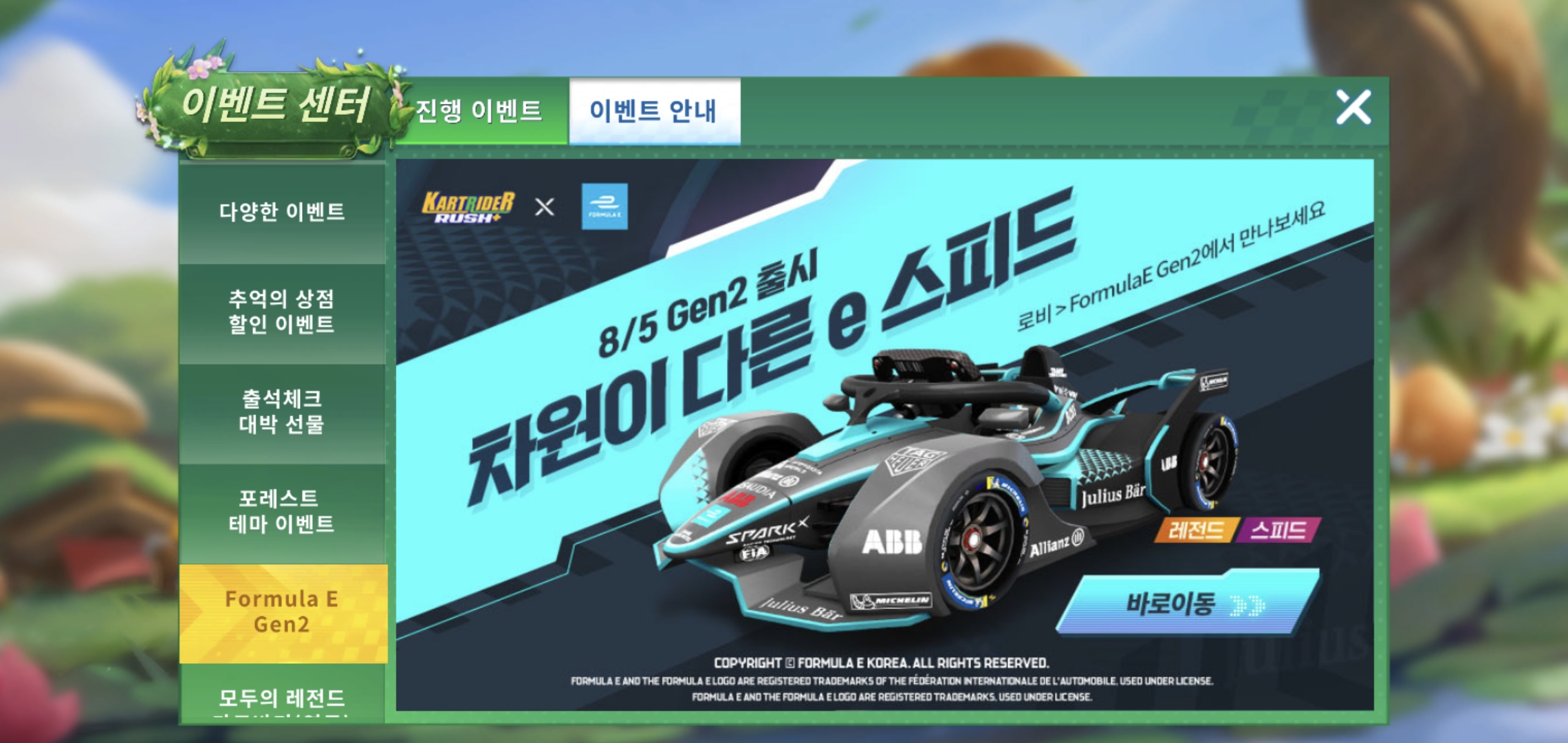 카트라이더 러쉬플러스에 8월 5일 자로 포뮬러 E 카트인 Gen2 카트가 콜라보 출시가 이루어졌습니다.