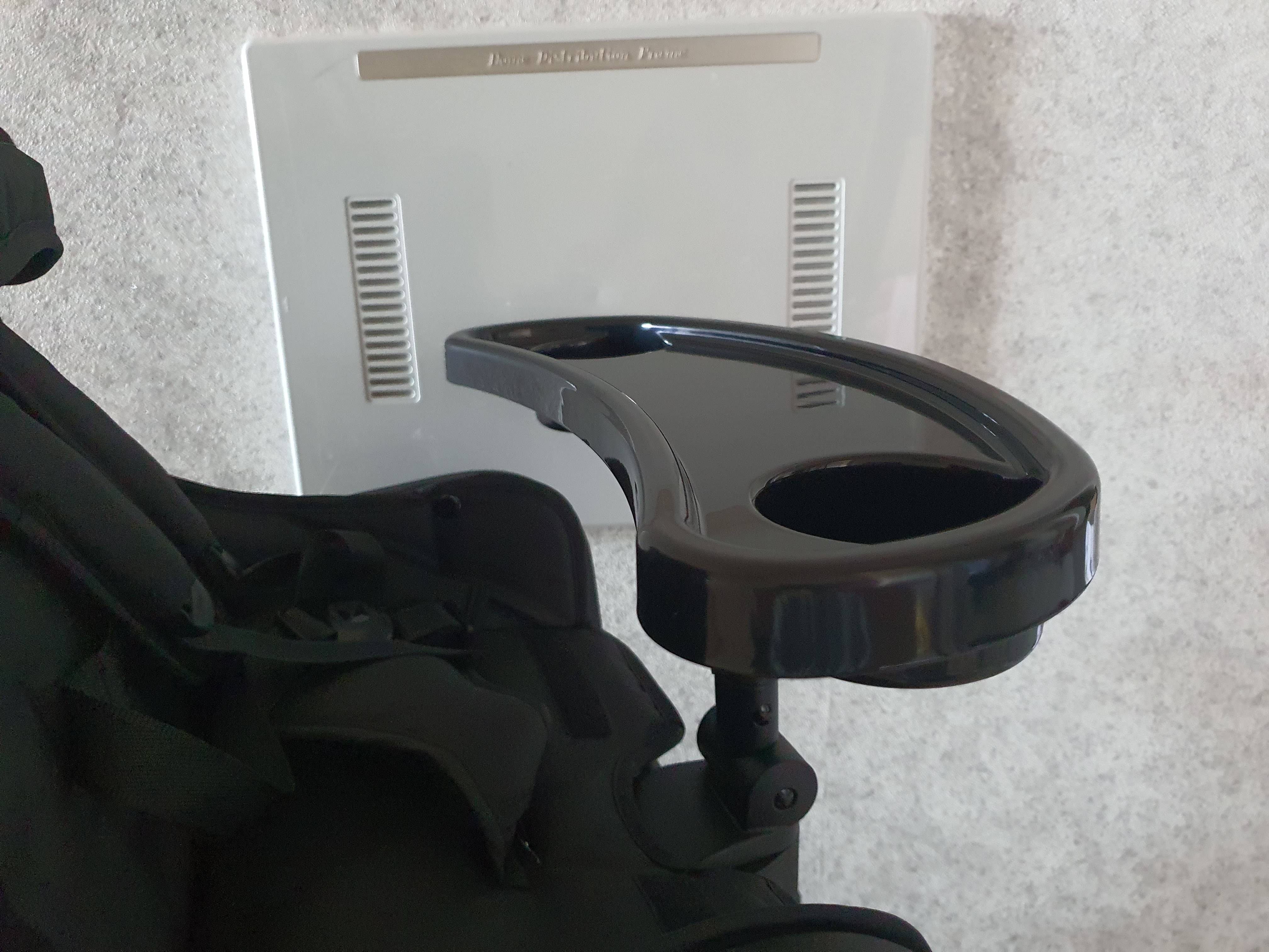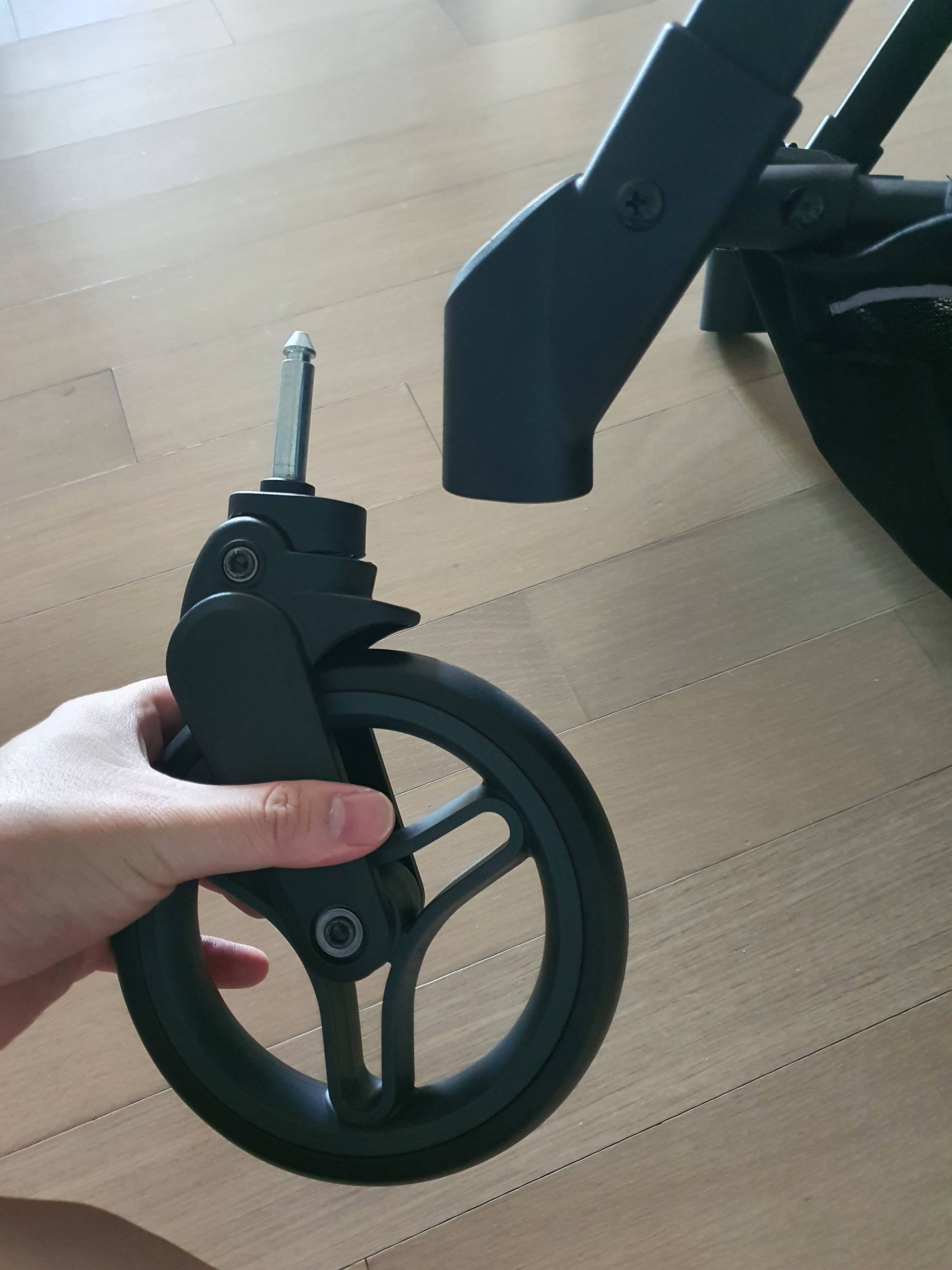 앞바퀴 두 개와 뒷바퀴 두 개 외 증정용 식판 대신에 설치하는 T바(안전바)가 첫 번째