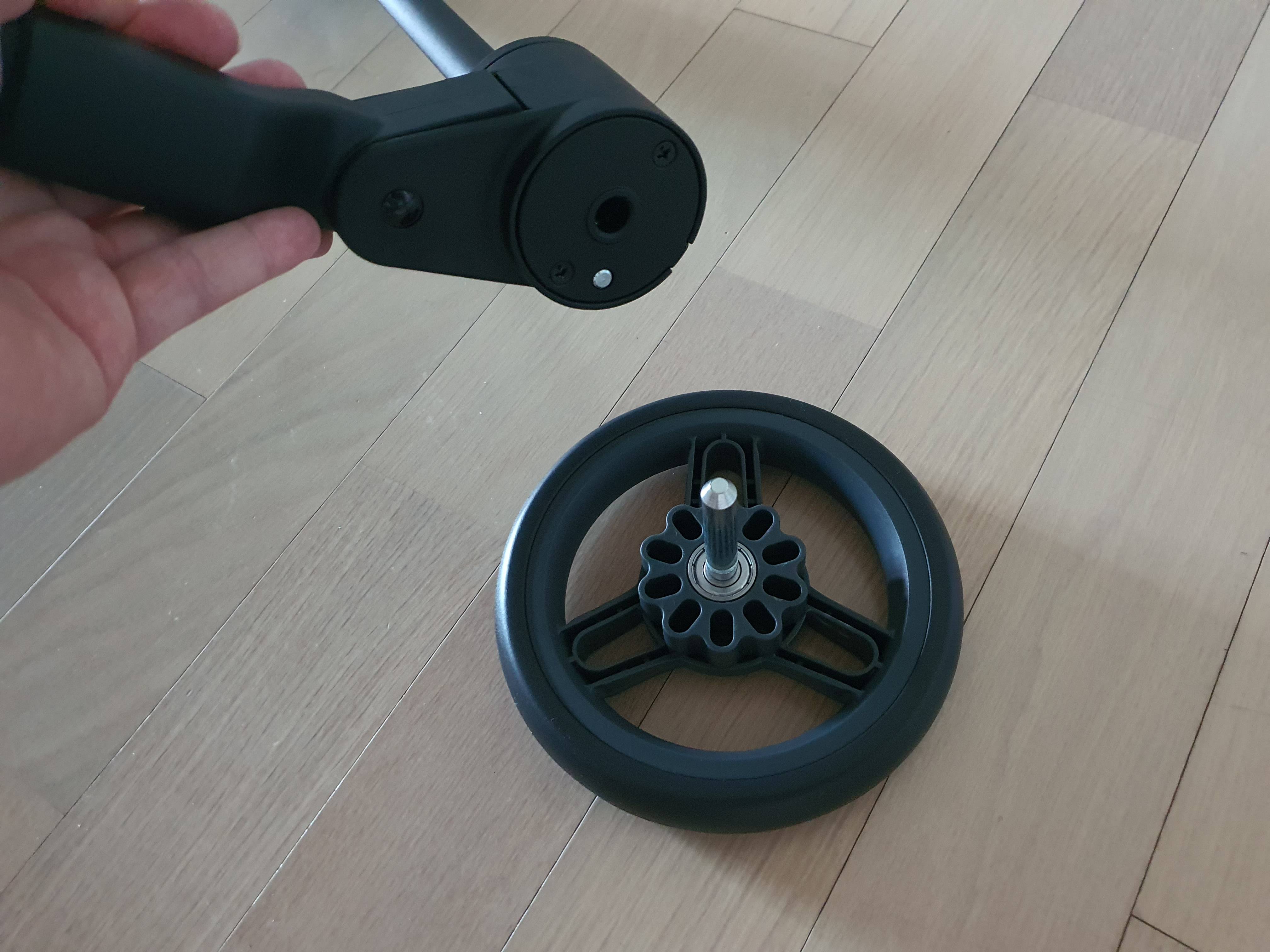 굳이 설명을 할 필요가 없을 정도로 너무 간단해서 툭툭 두 번만 하면 뒷바퀴도 조립이 완료됩니다.