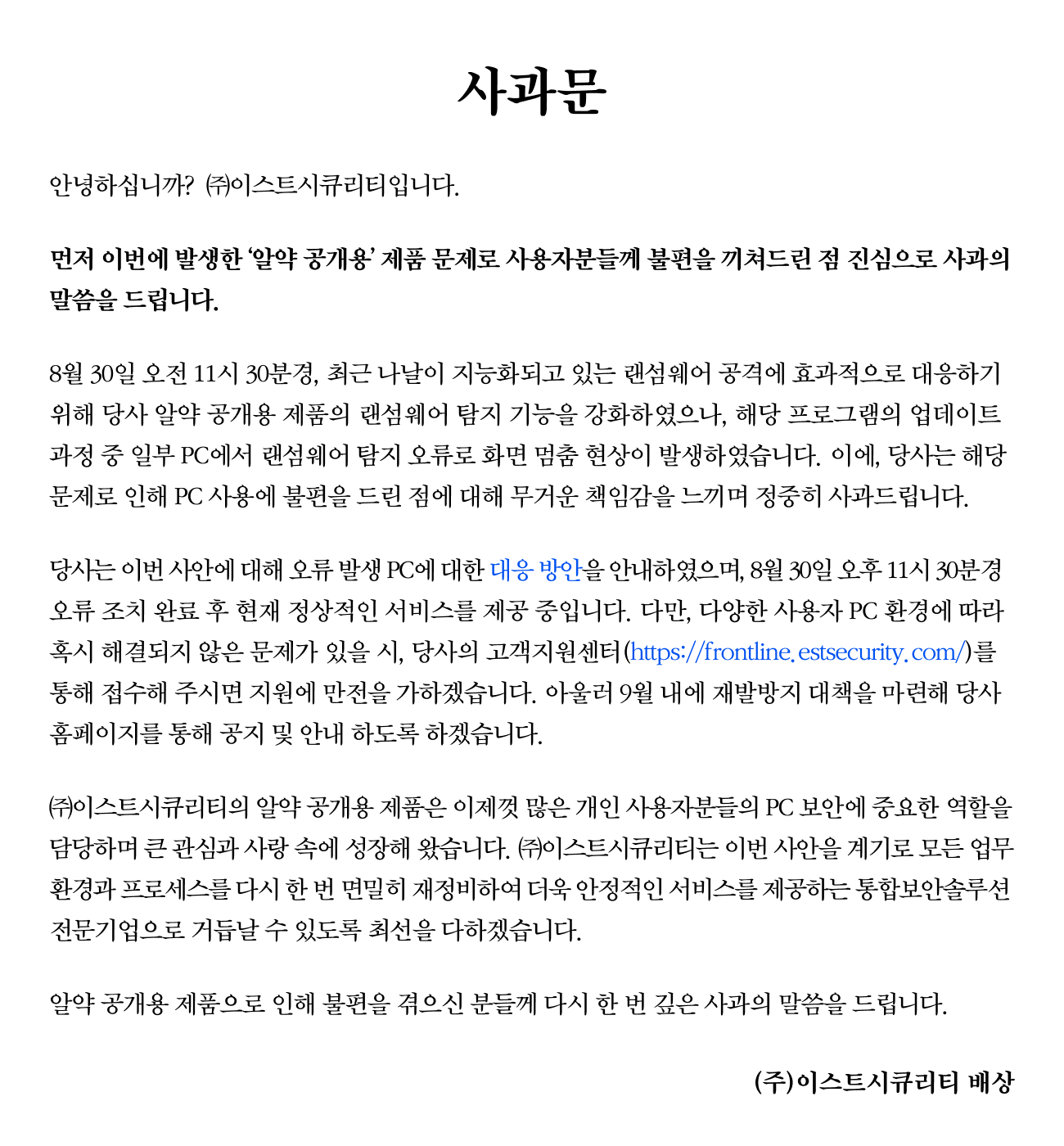 ㈜이스트시큐리티입니다. 이번 ‘알약 공개용’ 제품 문제로 사용자분들께 불편을 끼쳐드린 점 진심으로 사과의 말씀을 드립니다. 금일 발생한 오류는 랜섬웨어 공격에 효과적