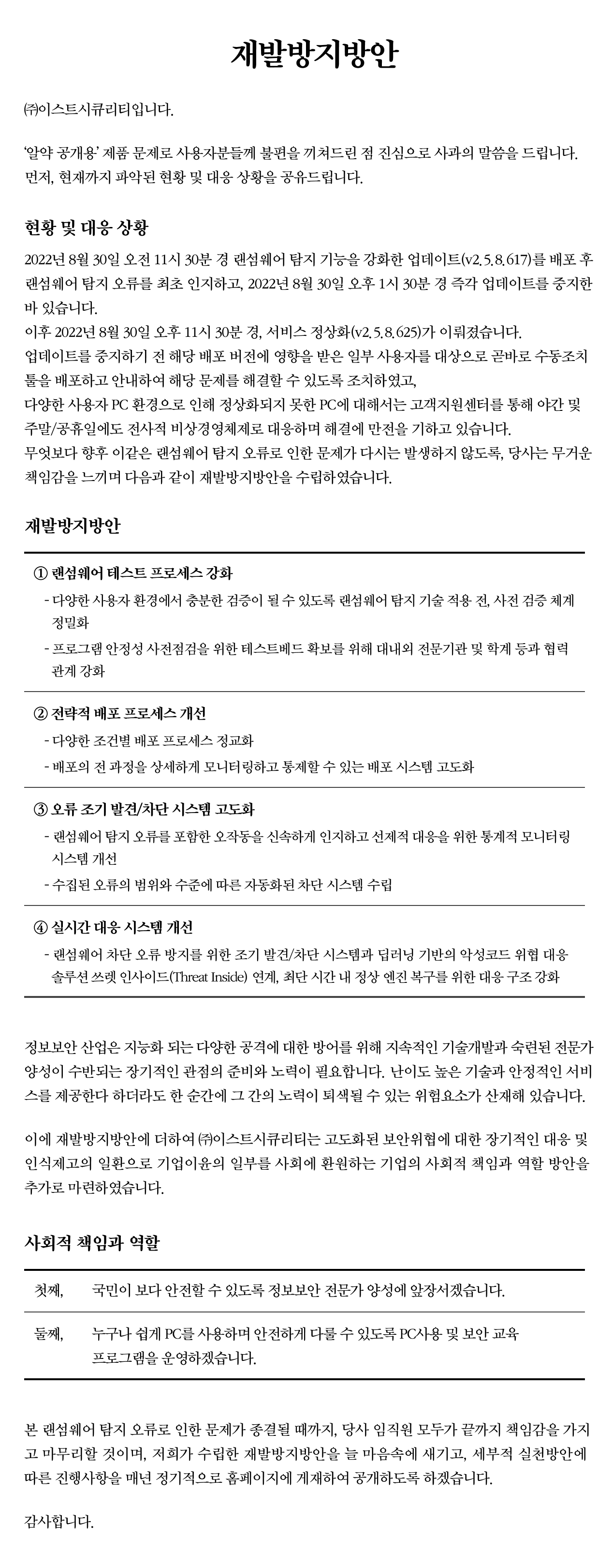 이에 대한 사과문과 재발방지방안을 자사 홈페이지에 게재한 상황입니다.