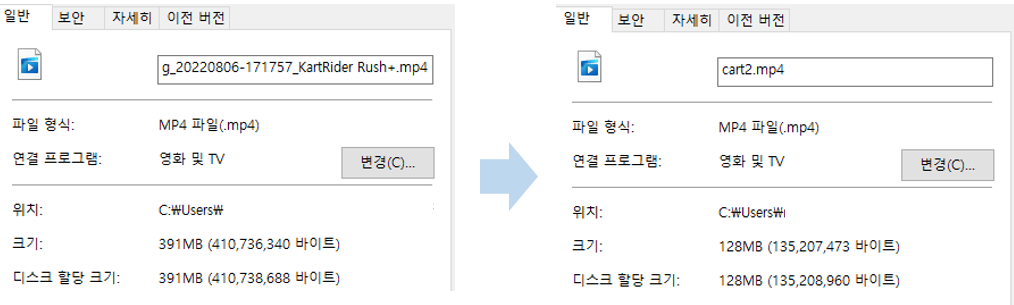 제가 녹화했던 원본 캡쳐영상의 용량은 391 MB인데 똑같은 MP4 포맷인데 128 MB까지