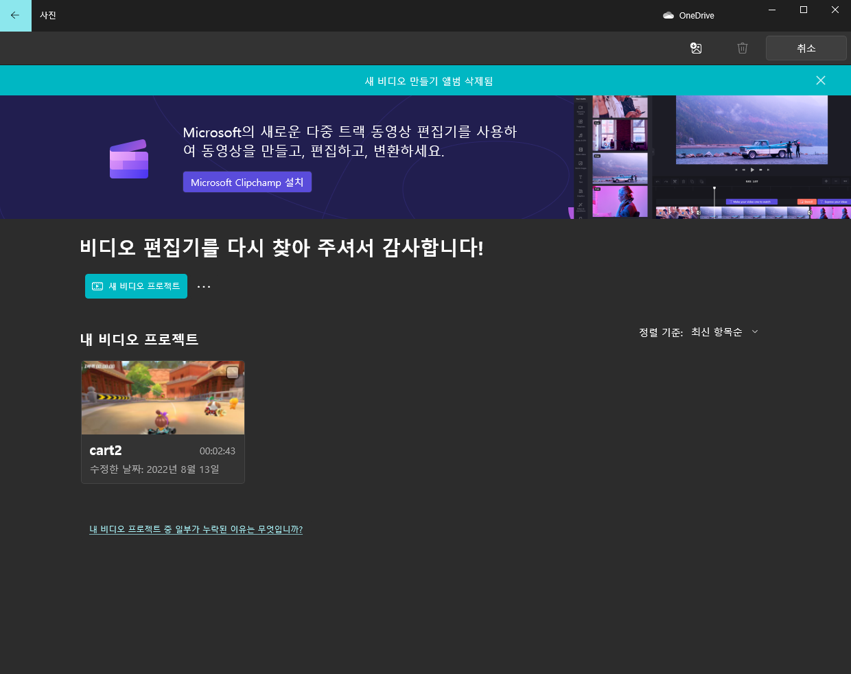 한 개의 편집 영상이 잡혀 있는데 여러분은 처음 프로그램을 구동했기 때문에