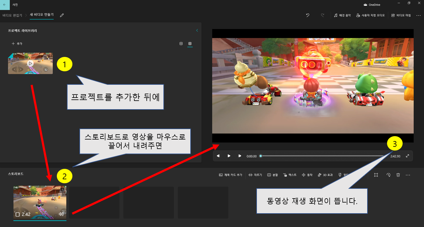 일단 새로운 프로젝트를 추가 한 상태에서 아래 스토리보드라는 곳으로 영상을 끌어내려주면