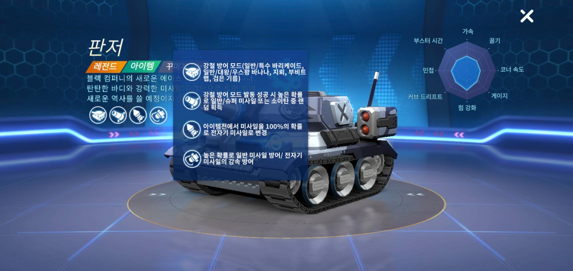 탱크라는 특성을 가진 카트답게 강철 방어 모드라는 특성이 붙어 있어서