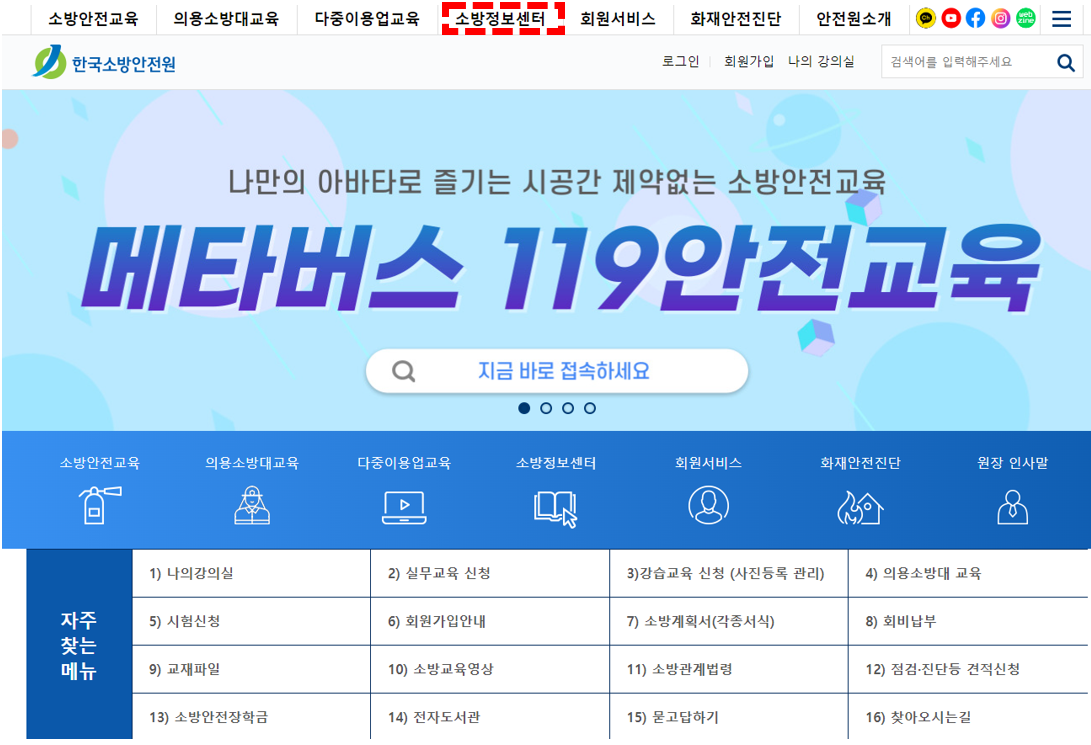 여기서 상단 배너중 "소방정보센터"를 클릭해 줍시다.